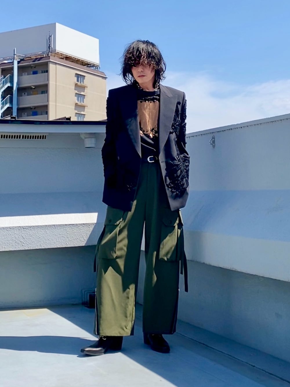 こんにちは。 購入したアイテムを初めて下ろす時って 妙に気合が入ります。 いい感じに合わせるのはもちろんですが その日の自分の気分や天候も反映させて なるべく最高のひと時にしたい。 このテーラードを着る機会を伺いながら 最初はどのパンツで合わせようか、などと悩んで数ヶ月。 (買ったの1月) そろそろシーズン逃しそうなので満を持して着用しました。 どうせなら今期まだ着用していないパンツに合わせようと 王道のミリタリー合わせでカーキ×ブラック。 インナーのプリントとブーツの金具でゴールドを差しました。 このパンツ、キレイめ素材で作ってあるので バランスが取りやすいんですよね。 ところがこのコーデ撮影後、 トイレに行ってファスナーを下げたら そのままファスナーが壊れて閉まらなくなるという 予想だにしなかったまさかの事態。 突然の別れに涙するのでした。