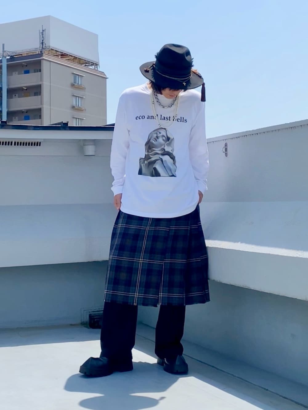 こんにちは。 友人のバンドのTシャツ。 売る気のない物販としてネタ的に置いてあったものを 思いがけず頂いたのでライブに着て行きました。 コーデ的には重心を下に持ってきつつ ハットでバランスを取りました。 シンプルだけど捻った感じをイメージ。