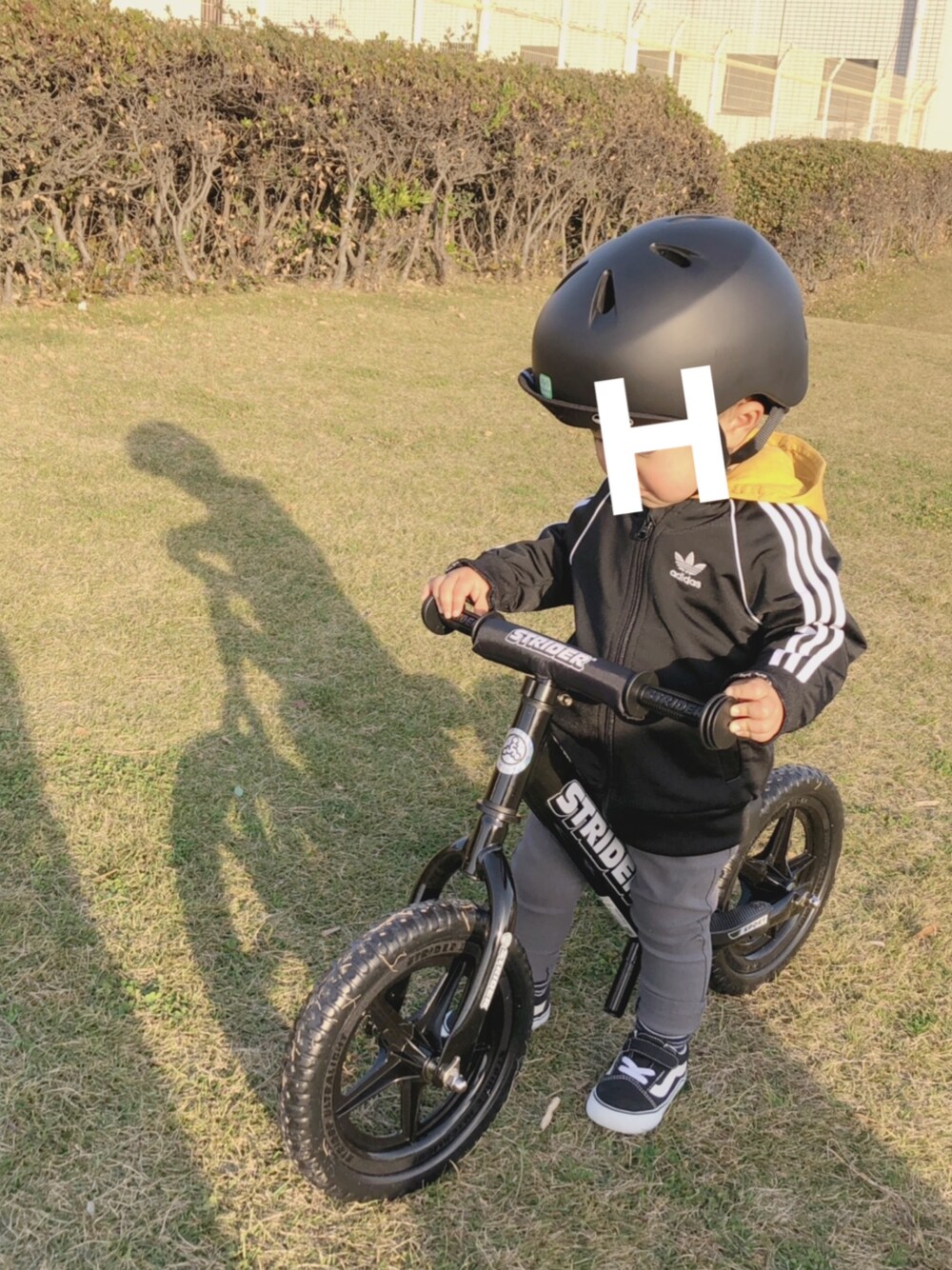ストライダーデビュー! 転んでも楽しそうにしてくれて よかったー🏁✨ ヘルメットには可愛いステッカーでも 貼ろうかな〜☺️🏁