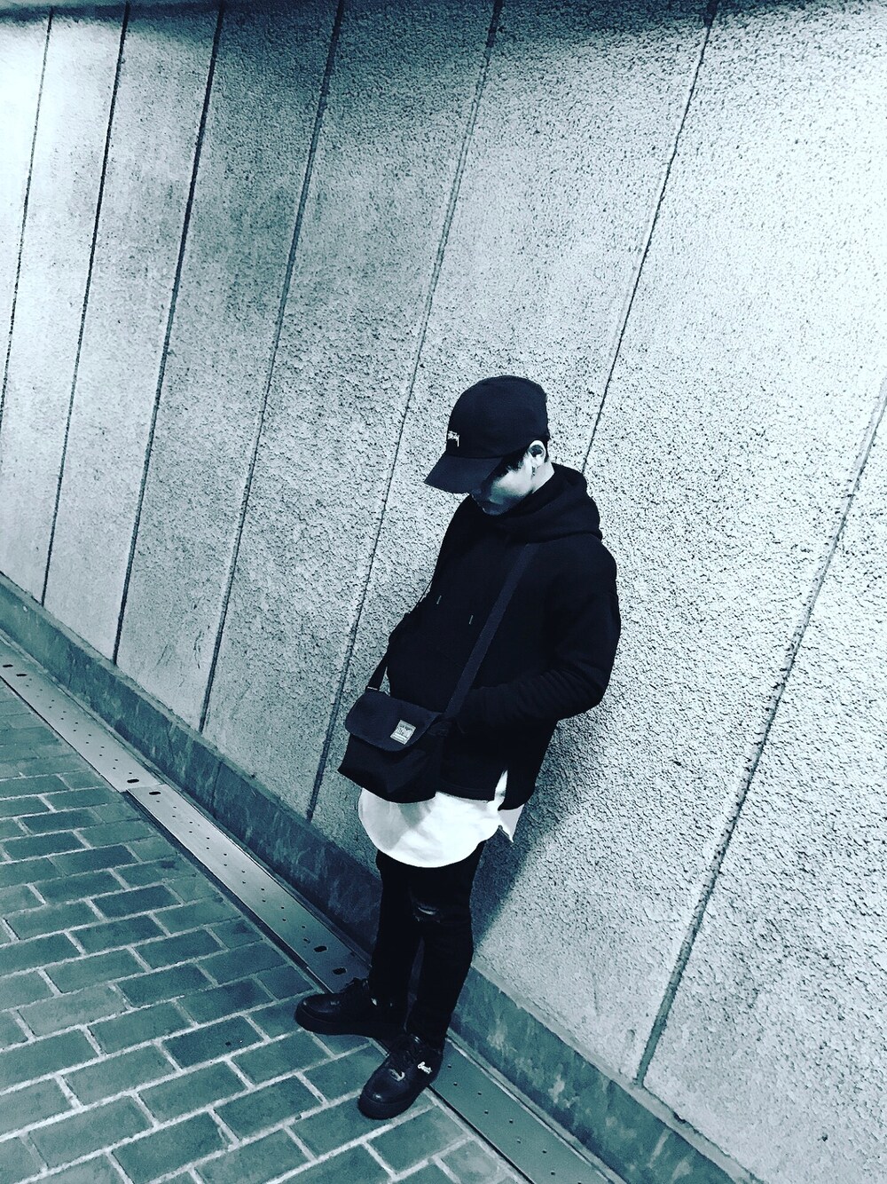 ブラック系のジャケット/アウターを着用したメンズの春コーディネートの1枚目の写真