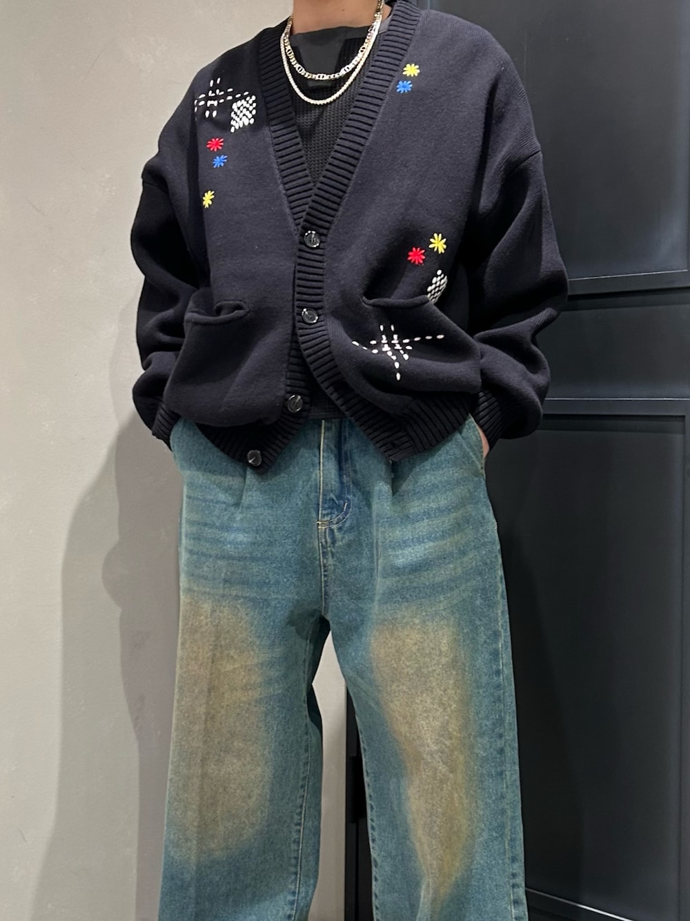 Bomnivoreのステッチニット、デニムを使ったコーデです! tops:Bomnivore size:M pants:Bomnivore size:M shoes:HOKA size:26