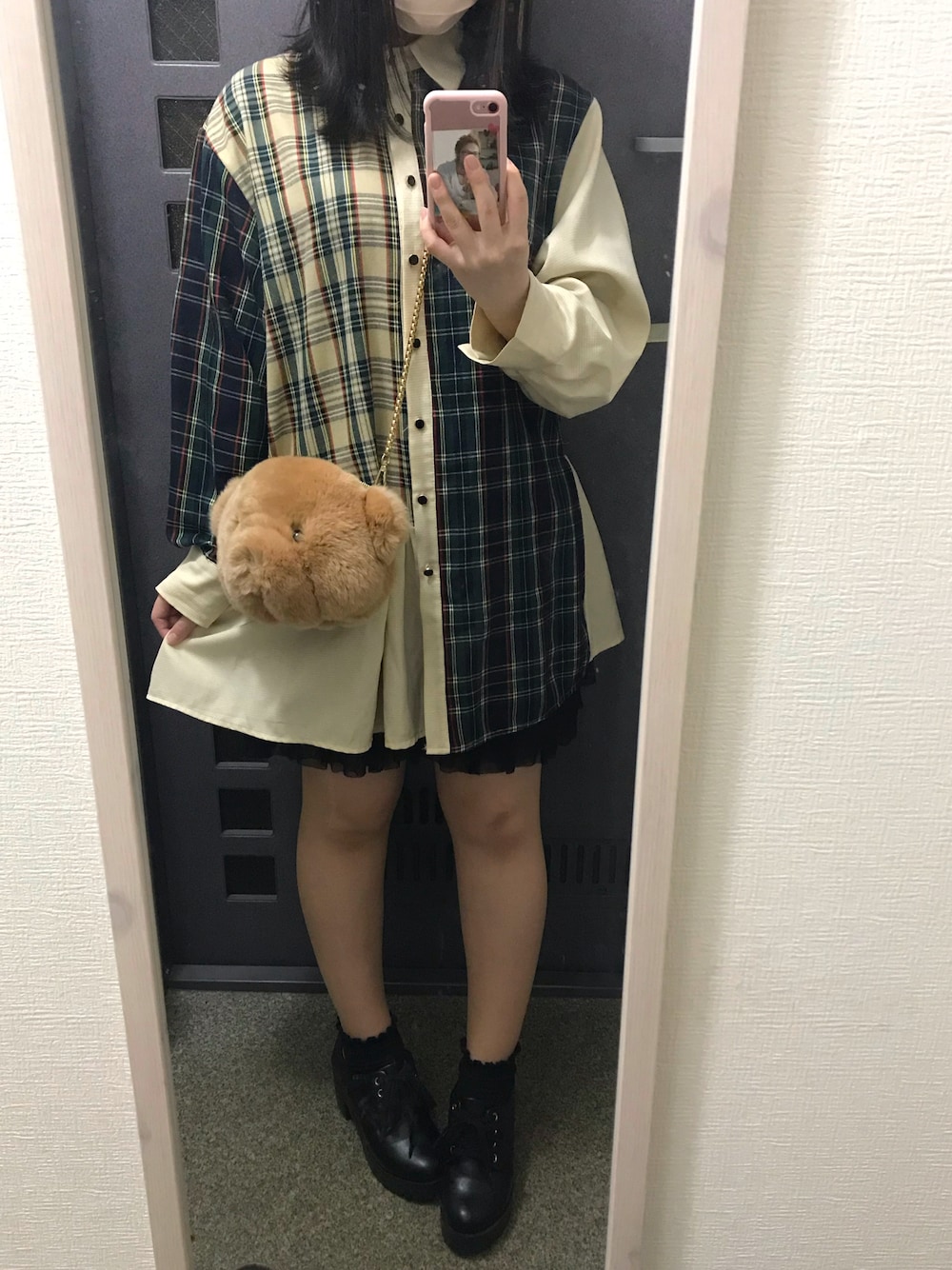 Belchicで買ったお気に入りのシャツワンピ⸜♡⸝ ワンピだけだと丈が短いしボタンの隙間から見えちゃいそうなので 下に(たぶん)しまむらで買ったスカート履いてます。 バッグは最近SHOPLISTで買ったくまのお顔してる可愛いやつ🐻 ちっちゃい財布しか入らないので バッグというよりアクセサリー 笑