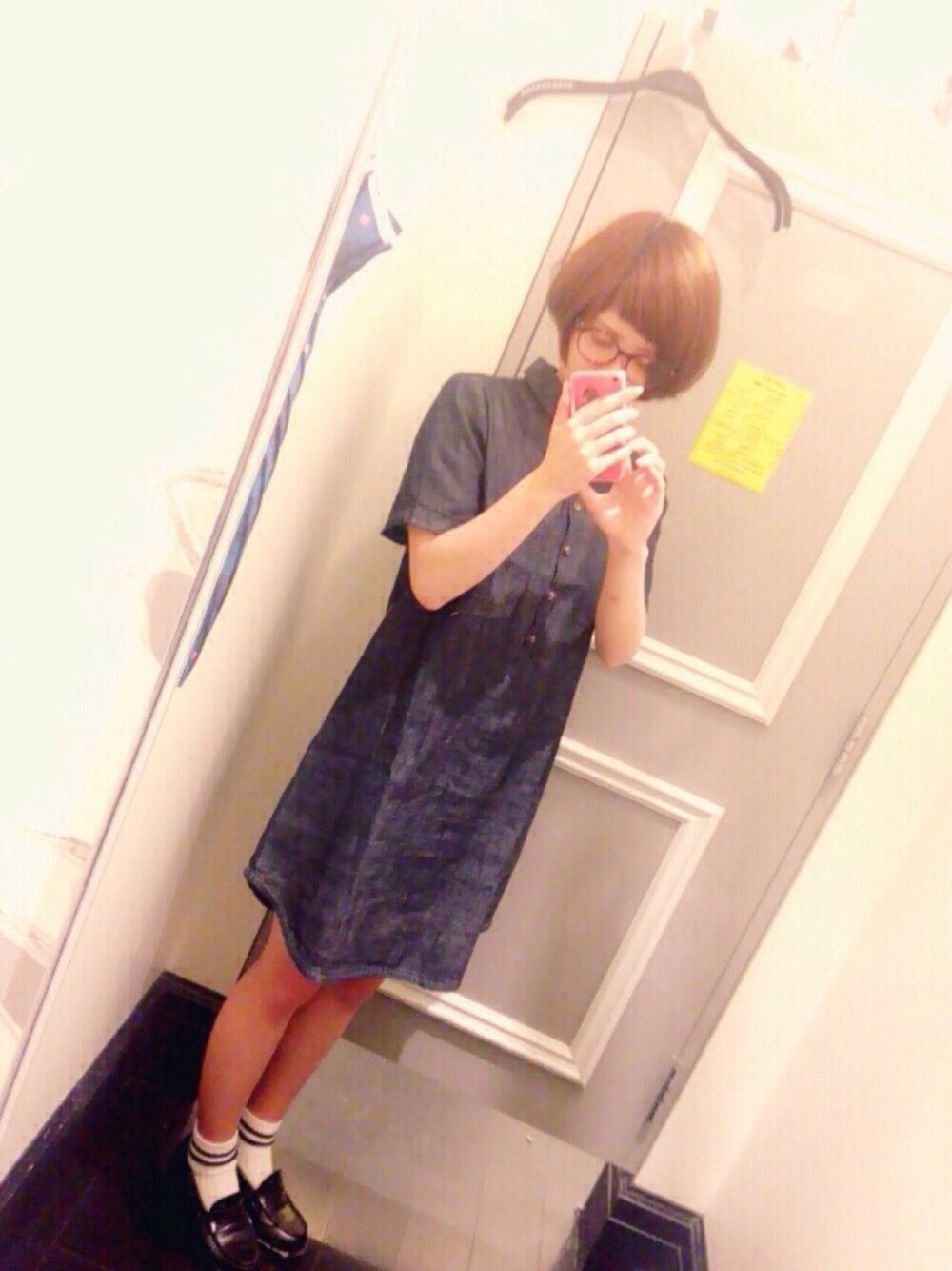 シャツワンピ(FOREVER21)¥2,790 メガネ(Zoff)¥5,000 ラインソックス(tutuanna*)¥350 ローファー(HARUTA)