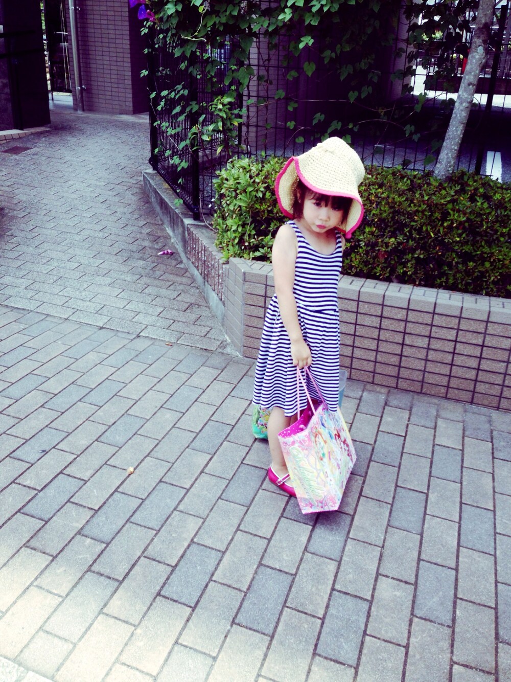 ピンク系のハットを着用したキッズの夏コーディネートの1枚目の写真