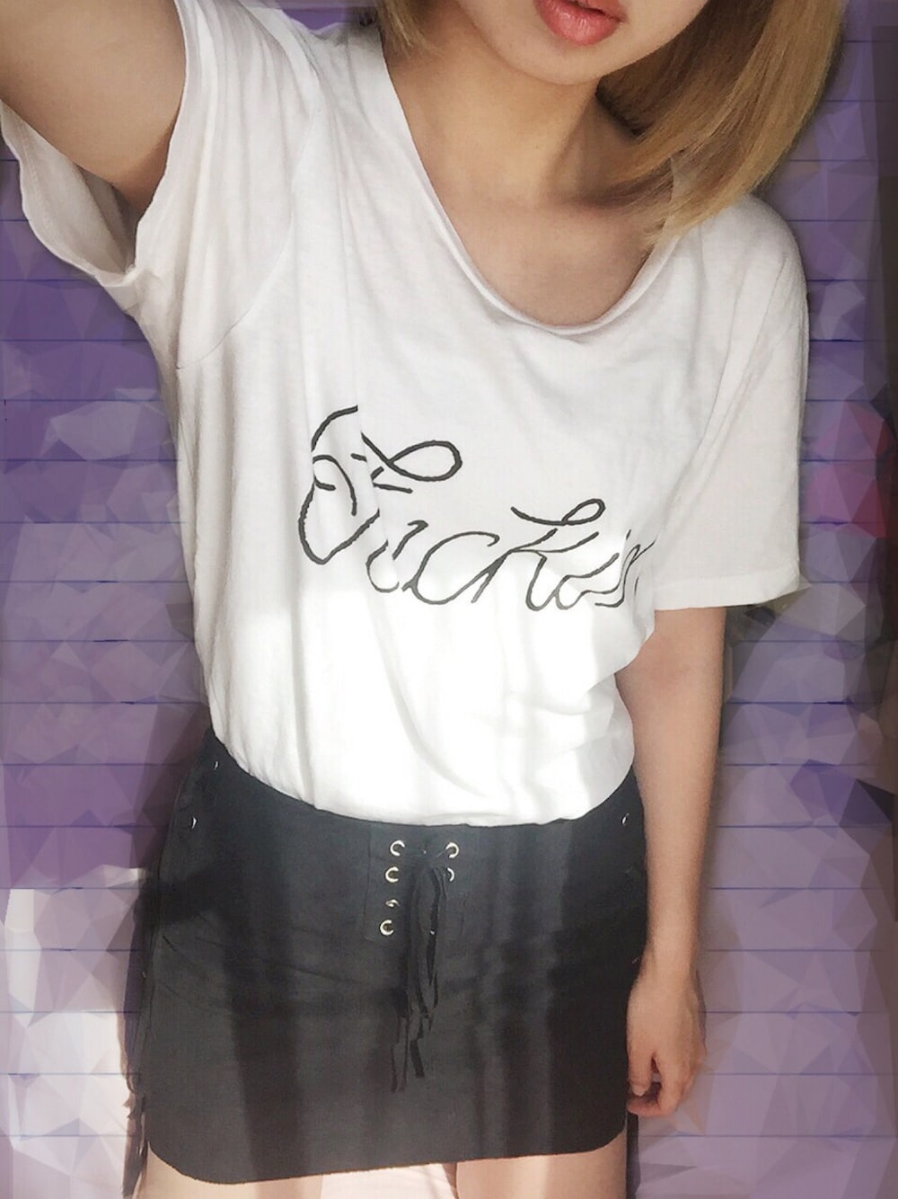 フリンジのミニスカートだから、シンプルなコーディネートも個性的になる♪ Tシャツは大好きなアーティストとお揃い♡ これにネイビー×白のスニーカーをあわせました!