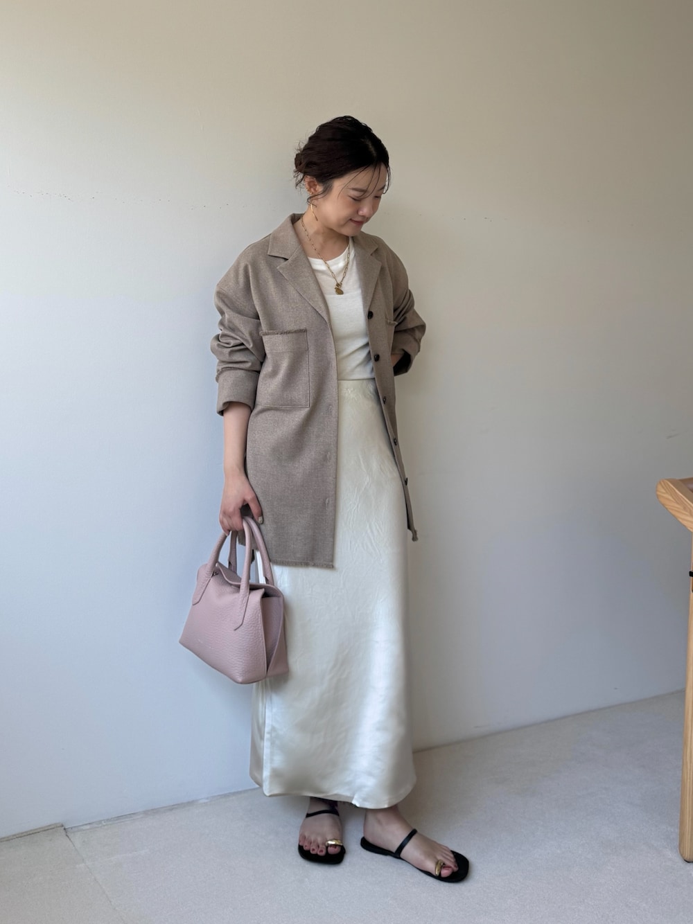 ベージュ×ホワイトでまとめたやわらかなスタイリングに、さりげなく華やかさをプラスしてくれる新色ピンク。 すっきりとしたフォルムと、やわらかなレザーの質感が魅力のバッグは、 きちんと感がありながらもデイリーに持ちやすいデザイン。 コンパクトなサイズ感で、手持ちでもバランスよく決まります。 くすみ感のある上品なピンクだから、 甘くなりすぎず大人っぽく取り入れられるのもポイント。