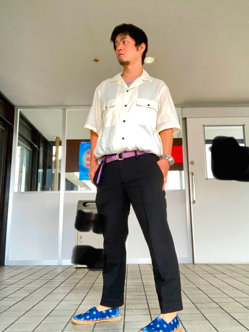 リネンという事で。雨が上がってかなり蒸し暑くなりました。 夏っぽい装いに逆戻りです。 モノトーンな感じになったので、ベルトとエスパドリーユに柄を持たせました。 チープになりすぎないように時計でバランスをとりました。