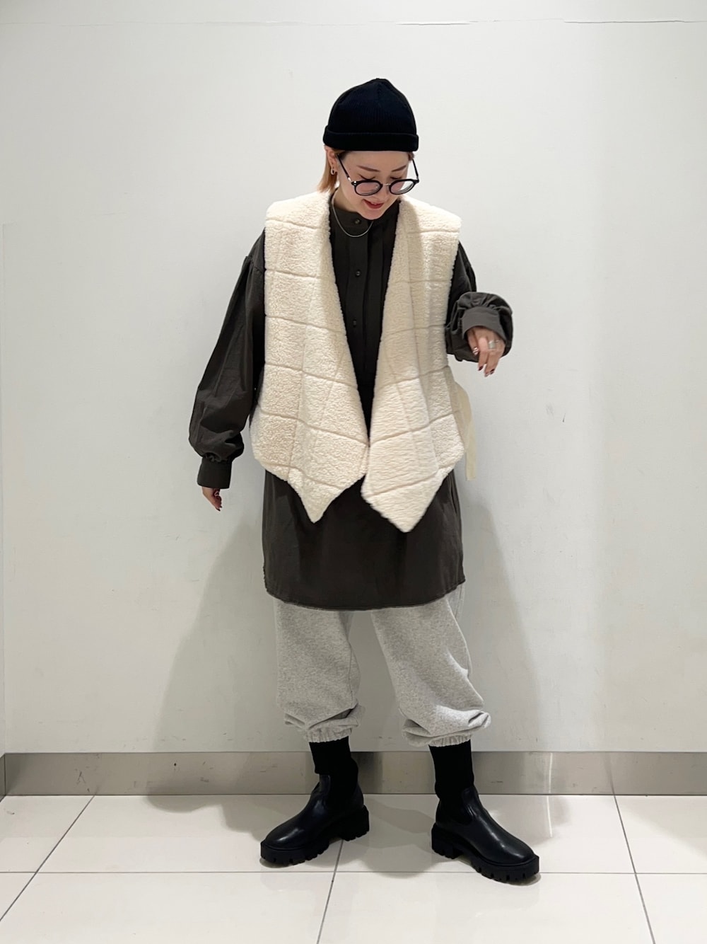 ボアベストコーデ🦙♡ KBFの大人気ボアベストで カジュアルコーデを組みました🤲🏻🌱✨ もこもこかわいい~~🥹🫶🏻 リバーシブルで柄違いなのもポイント◎ サイドを留めるとよりボリューム感UP🐏🐏🐏 ミニドレスはカーキで秋らしさ全開! 深めのカラーで大人っぽく落ち着いた印象に🪽 パンツはあえてメンズのスウェット🥓🍳 個人的にきれいめアイテムに めちゃカジュアルなアイテム合わせが気分♪ ぜひお試しください✔️✔️