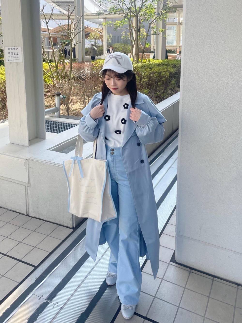 ケープデザインがポイントのトレンチコート!ブルーカラーが今年っぽい◎全体的にブルー×ホワイトを意識したコーデ!爽やかカラーで春らしさ満開🐰🩵トレンチコートはXS/S/M展開!こちら身長144cmでSサイズ着用です◎