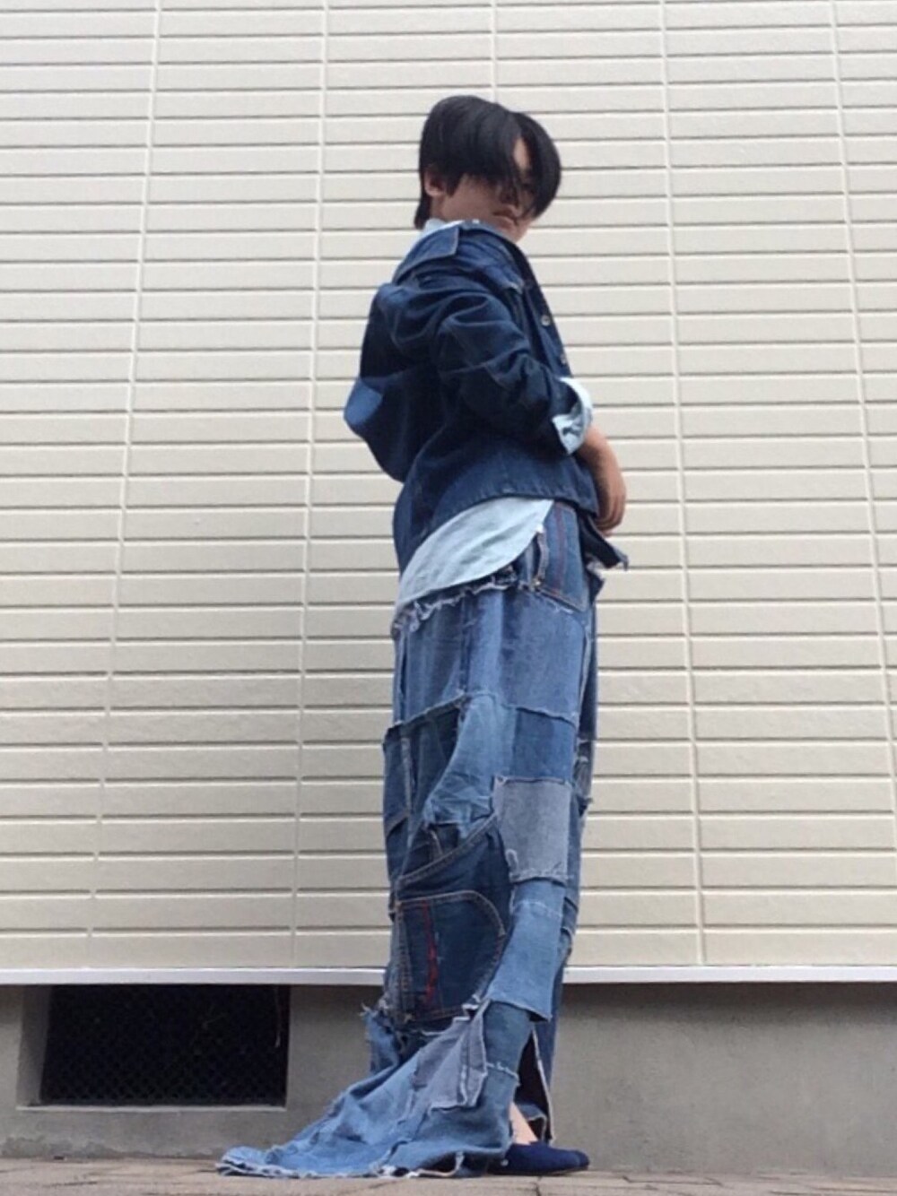 デニム人間です。 デニムのパッチワークを腰に巻いて、スカートとして着てます。 めっちゃ重いです(笑)