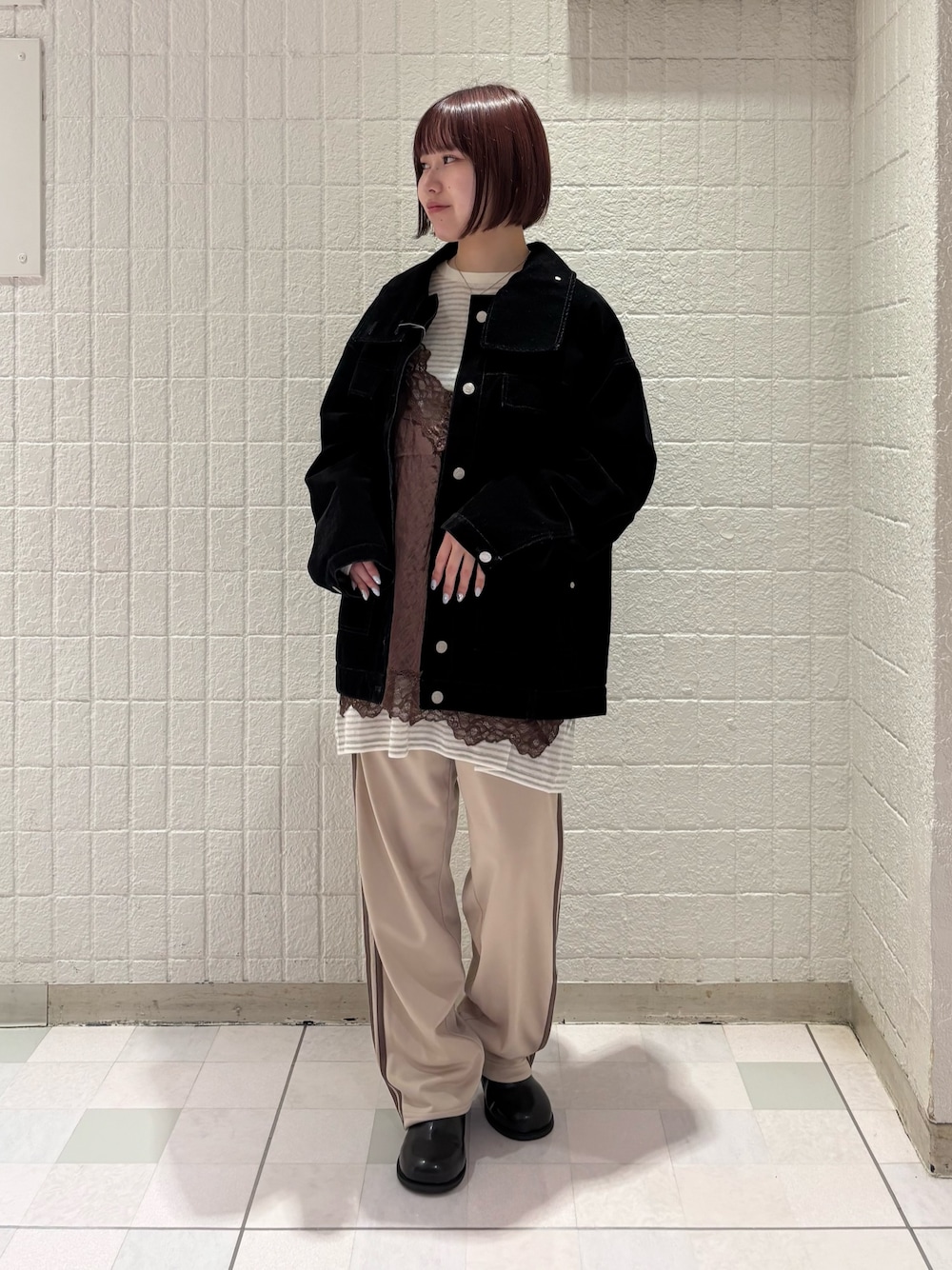 ご覧いただきありがとうございます!♡ ゆるっとしたボーダートップスにレースキャミを合わせて、adidasのトラックパンツでスポーティーに、、! 全体的にゆるっとしすぎないように黒のデニムブルゾンを合わせて締めたスタイリングにしました!重ね着が可愛いです、、!♡ ぜひ参考にしてみてください!