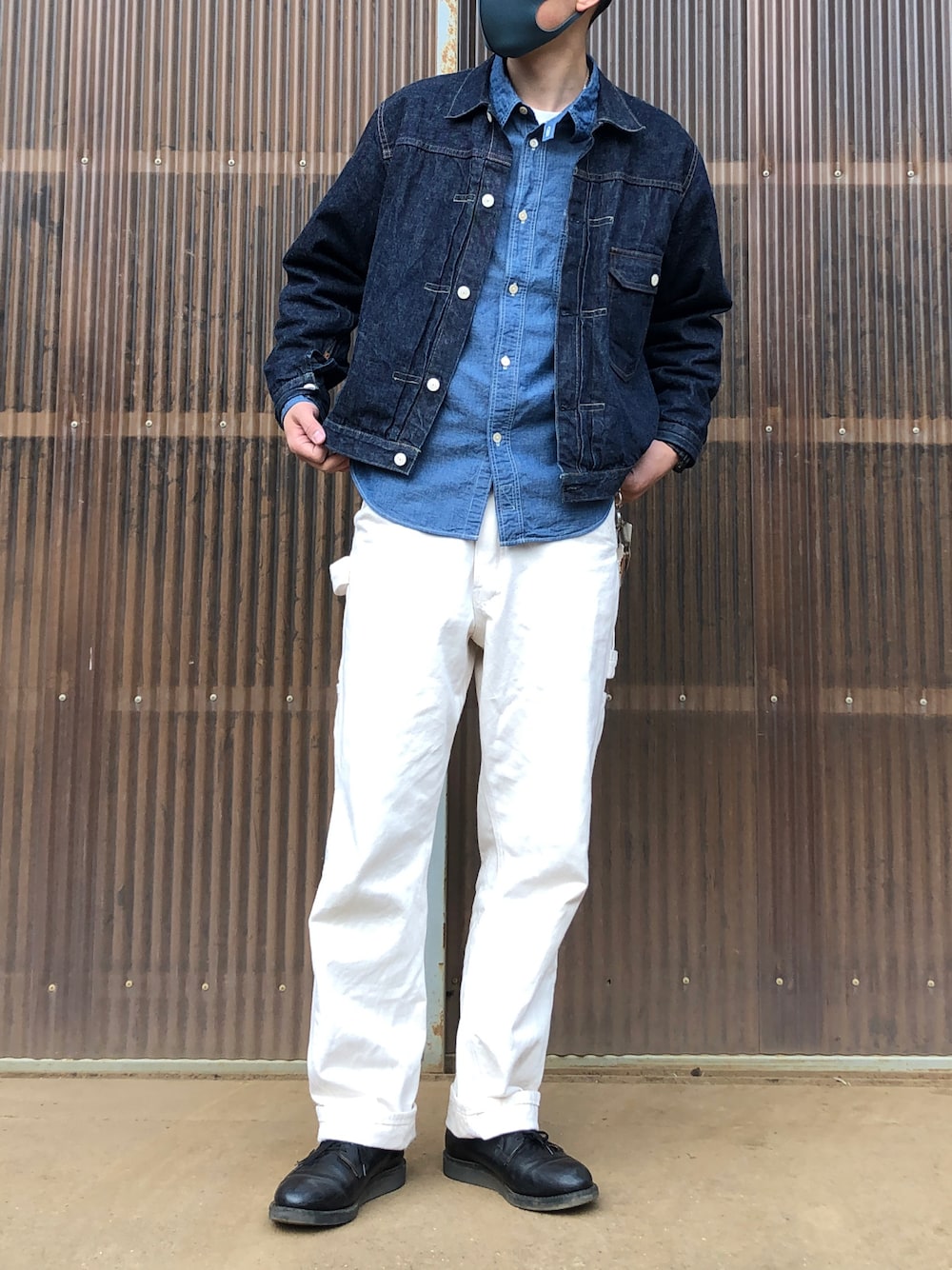 シャンブレー×白パン シンプルコーデ DELUXEWAREのシャンブレーシャツに、Tradesmanのペインターパンツを合わせて綺麗めな感じにまとめてみました。 ジャケットはWAREHOUSEのDuck Diggerシリーズ。 デニムジャケットはカジュアルにもいけますが、シャツやブーツと組み合わせると落ち着いた雰囲気になりますね。 シャツはDELUXEWAREのゼブラシャンブレーです。生地感がかなり良いです。チンストラップも可愛いですね。 一枚で着るためにLサイズを購入しました。中に着るなら袖を折った方が丈はよいかもです。 足元はREDWINGのポストマンシューズ。 雨の日にも強いと言われているので恐るおそる履きますが、気持ち的にはスニーカーの方が楽です。 気がちいせぇですね。 今日もありがとうございます。 いいねやフォロー嬉しいです。 とても感謝してます。 また良かったら見てくださいね〜。