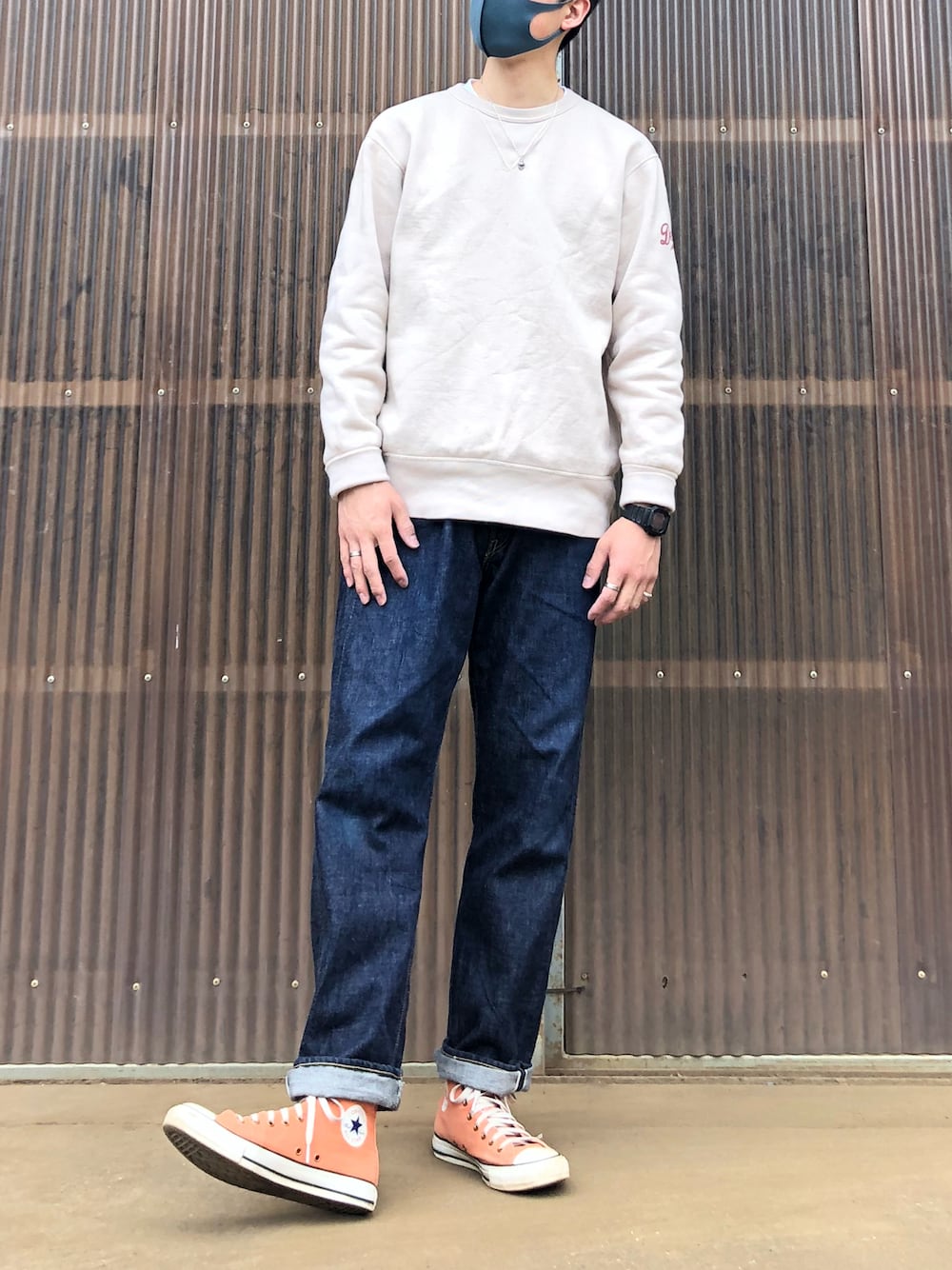 スウェット×ジーンズ カジュアルコーデ DELUXEWAREの定番 厚手なスウェットに、FULLCOUNTの1101 ミドルストレートのシルエットを太めで合わせてみました。 足元はコンバース オールスター。 トップスがベージュなので、 明るめなサーモンピンクで春らしく合わせてみました。 かなりカジュアルで楽々コーデですね。 野暮ったくなり過ぎないようにジーンズも腰履きせず、ロールアップも細めにしてみました。 スニーカーもハイカットなので、ロゴが見えて可愛いですね。 夏に履くならもう少し丈詰めしても良さそうです、迷います。 今日もありがとうございます。 また良かったら見てくださいね〜。