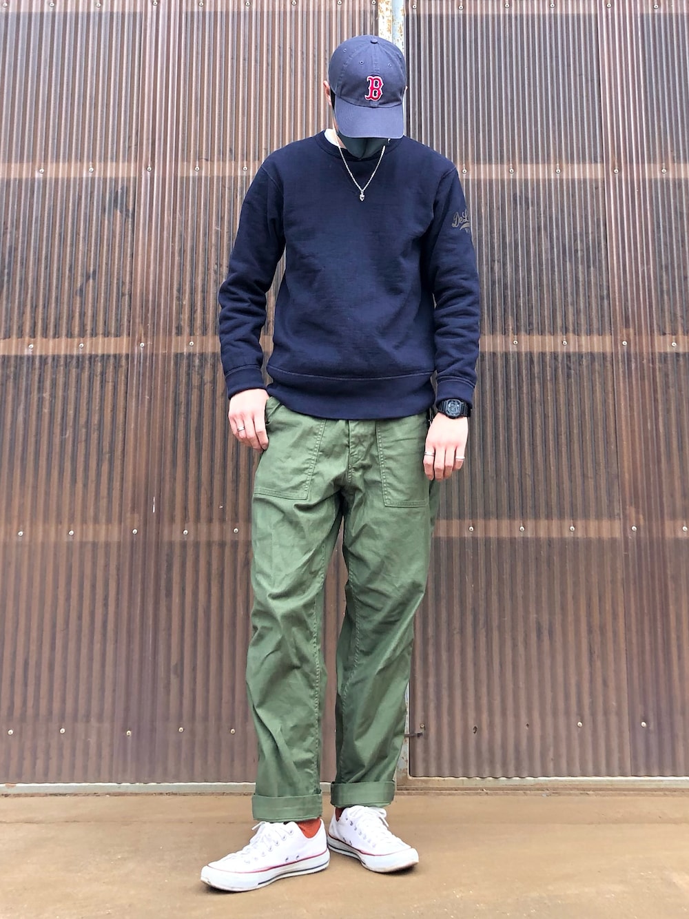 スウェット キャップ カジュアルコーデ DELUXEWAREの定番スウェットをジャストめのサイズ感で合わせてみました。 濃いネイビーがカッコいいですね。 UNIQLOのユーティリティワークパンツは米軍のベイカーパンツっぽい作りです。 ただテーパードがしっかり効いていて使いやすいですね。 色は写真よりもグリーンかなと思います。 カジュアルに合わせたかったので、色落ち加工された47Brandのキャップ。 足元はローカットの白いコンバースです。 思ったより春っぽくはならなかったですが、サイズ感はぴったりなので良しとしましょう。 今日もありがとうございます。 また良かったら見てくださいね〜。