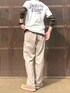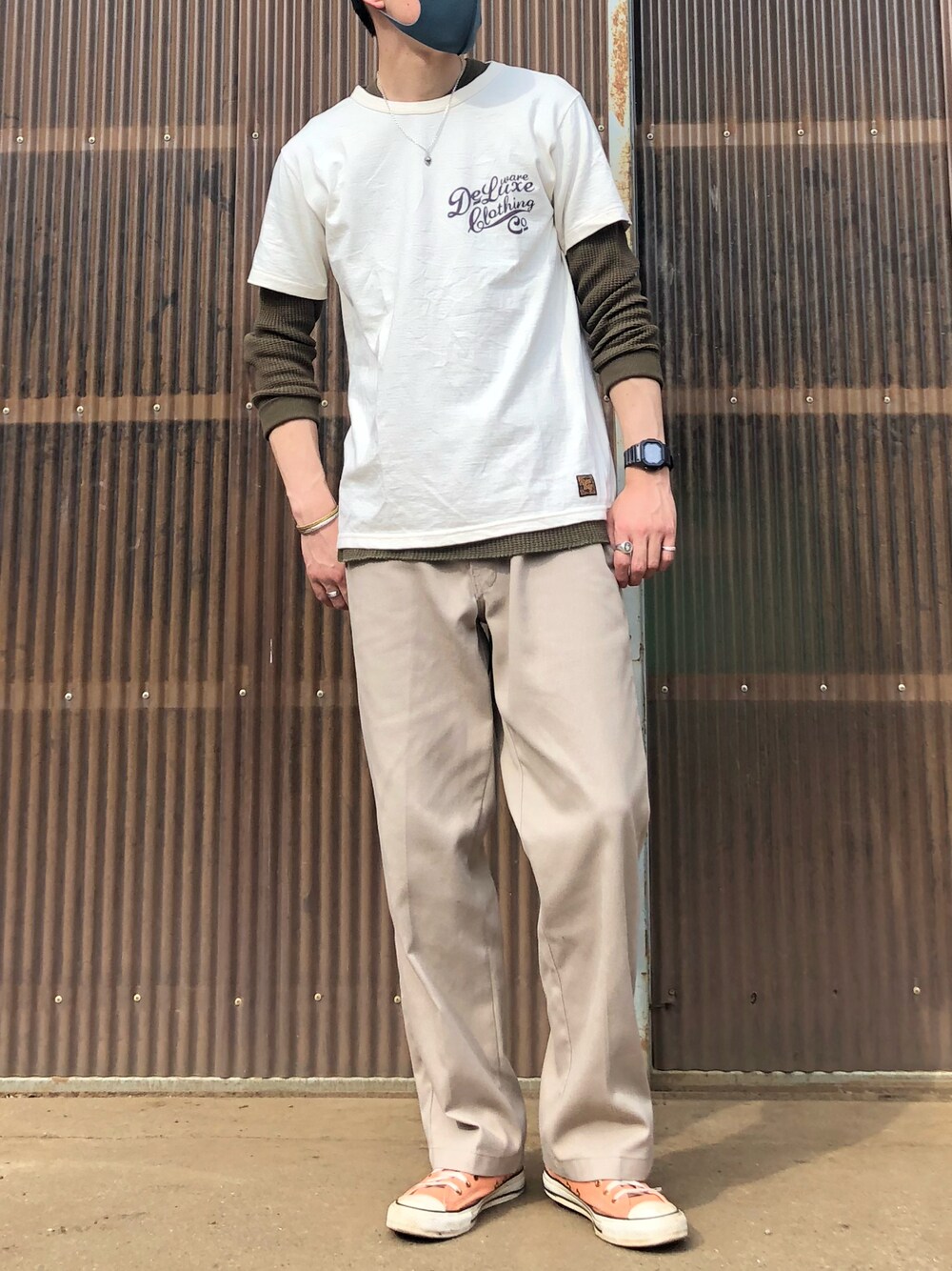 Tシャツ×サーマル アースカラー コーデ DELUXEWAREの生成りな色合いのTシャツに、JELADO オリーブカラーのサーマルを合わせてみました。 パンツは柔らかめな生地のDickies FLEX。 色はカーキで、目に優しいナチュラルなコーデになりました。 足元は差し色で、サーモンピンクなコンバース オールスター。 春にピッタリな色で多用しがちです。 デラックスウエアのTシャツですが、生地感が柔らかく色合いも良いですね。 襟元は広めになるので気になる方は一応確認を。 腰位置のロゴマークのあるタグも凝ってます。 今日もありがとうございます。 また良かったら見てくださいね〜。