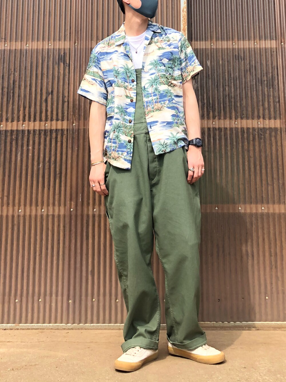 アロハシャツ×オーバーオール カジュアルコーデ JOHNBULLの大きめシルエットなオーバーオールに、MADE IN HAWAIIのRESERVE アロハシャツで爽やかに合わせてみました。 やはりアースカラーな色合いが一番落ち着きます。 足元はVANSのECO THEORY。 ベージュがオリーブとの相性バッチリですね。 着丈が短めのアロハになるので、よりオーバーオールの太さが際立ちますね。 ルーズな印象が今の季節にもぴったりです。 どちらも生地感は薄く、通気性があり楽に着れるのが良いですね。 今日もありがとうございます。 また良かったら見てくださいね〜。