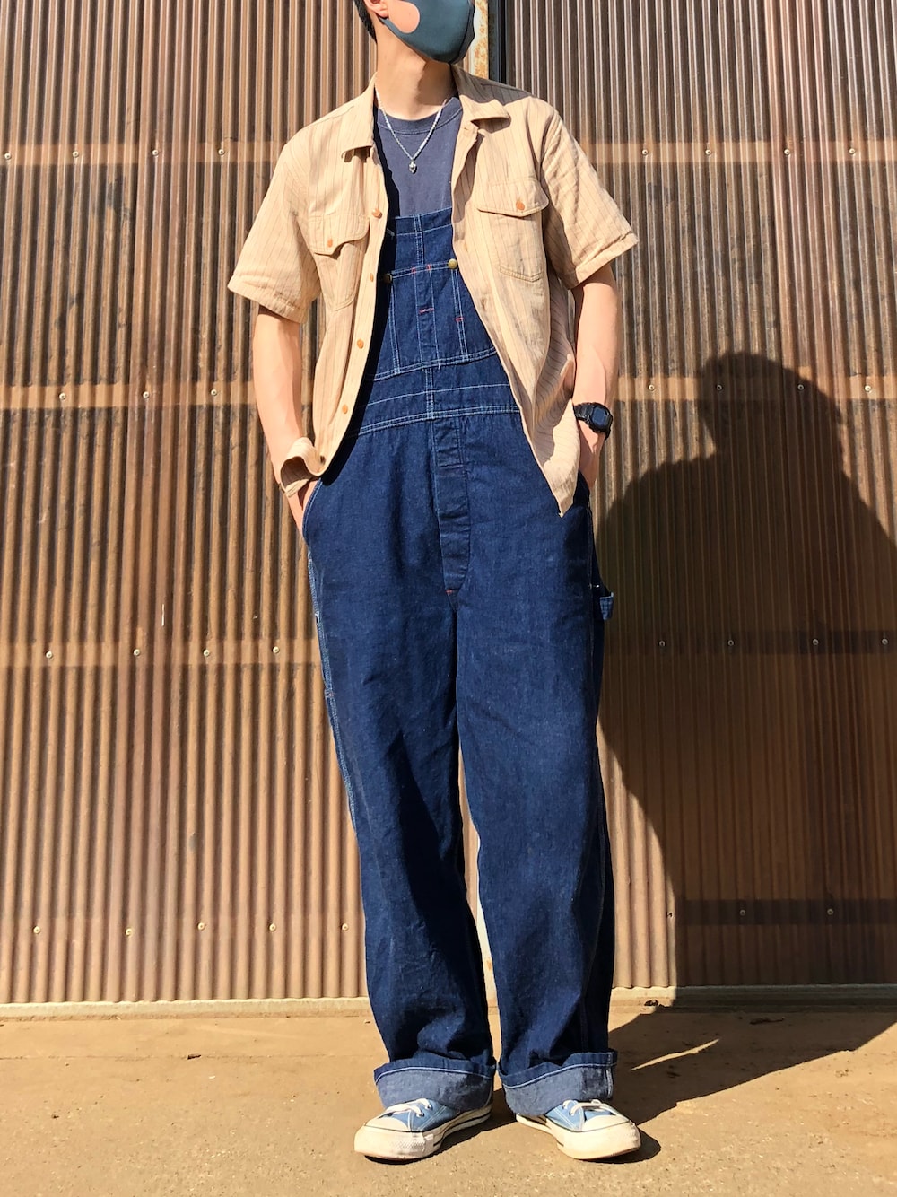 オーバーオール×ストライプシャツ カジュアルコーデ BIGYANKの90's オーバーオールに、SUGARCANEのコークストライプシャツをラフに合わせてみました。 インナーはGOODONのピグメント染めTシャツ。色合いが絶妙です。 足元はブルーのCONVERSEで、インナー、オーバーオールと同系色でまとめてシャツが際立てば良いかなと。思いました。 パリッとした生地感のシャツはヘリンボーンになってます。ワークシャツになるのですが、雰囲気バツグンです。 ルーズなサイズ感のオーバーオールとも相性がいい感じですね。 今日もありがとうございます。 また良かったら見てくださいね〜。