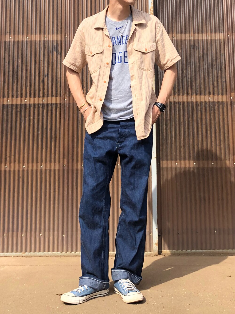 ワークシャツ×デニムパンツ ラフコーデ SUGARCANEのコークストライプシャツに、HEADLIGHTのデニムワークパンツでカジュアルに。 今日もありがとうございます。 毎日コーデを投稿しています、 また良かったら見てくださいね。