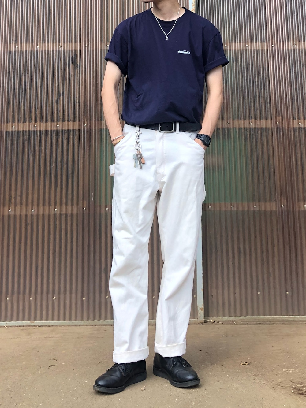 ホワイトワークパンツ タックインコーデ Tradesman のペインターパンツに、WildThingsのTシャツをタックインで。 足元はREDWINGのポストマンで綺麗めに。 今日もありがとうございます。 毎日コーデを投稿しています、 また良かったら見てくださいね〜。