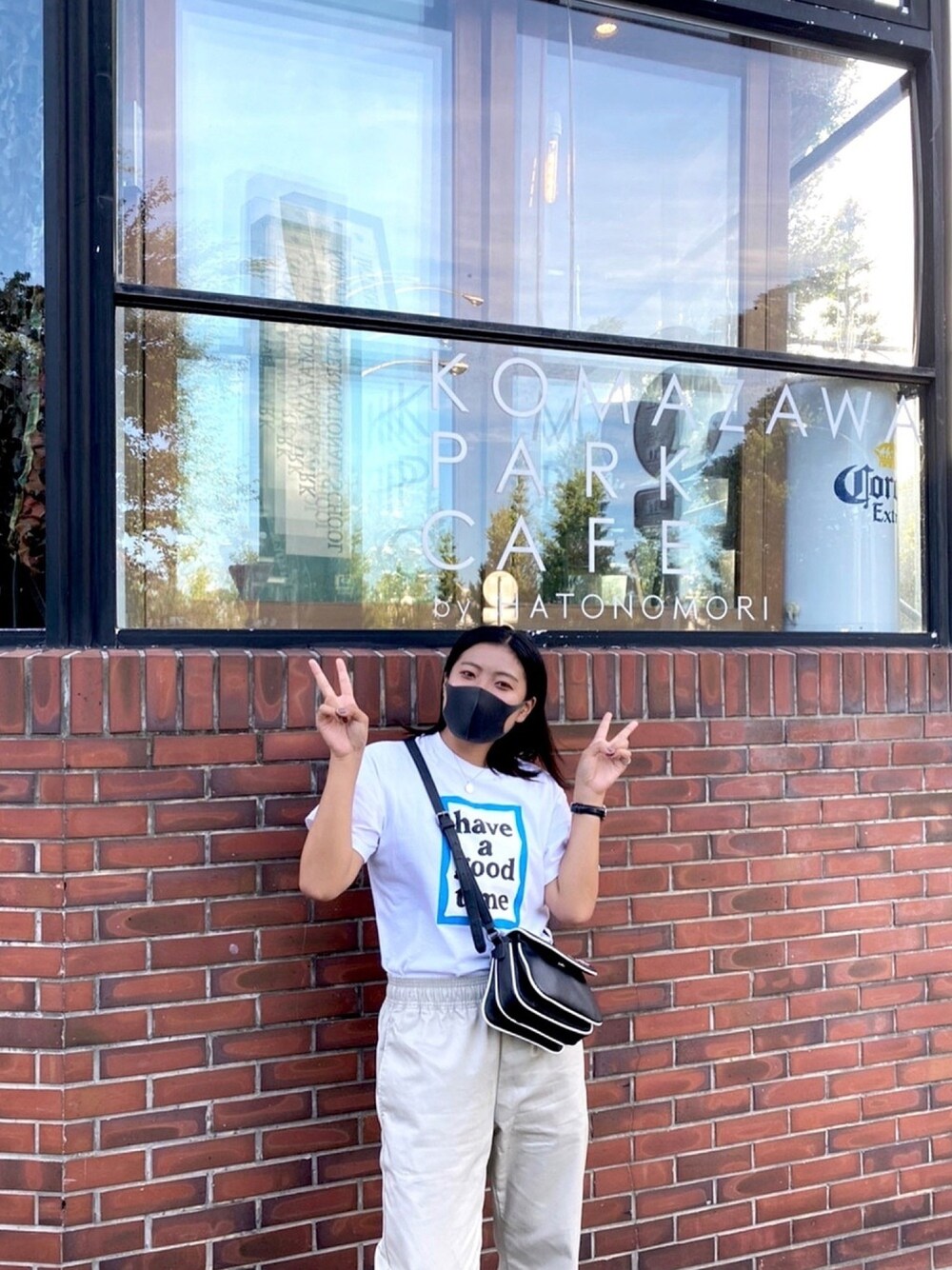 シンプルなホワイト系のコーデに have a good timeのフレームロゴ🦋 GUESSのカバンはサイズ感が好き❣️