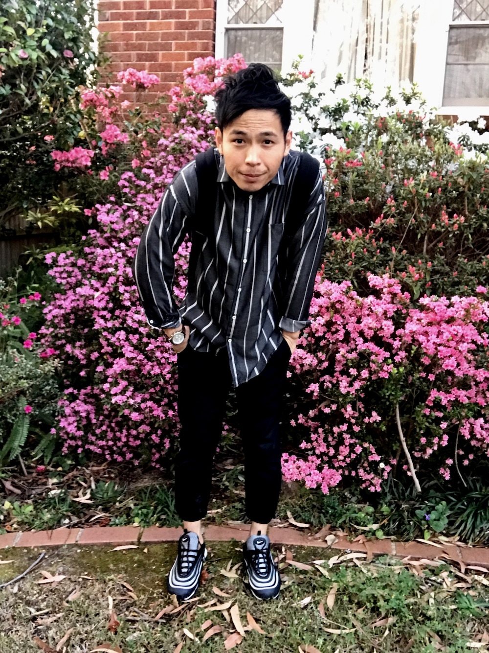 グレー系のトップスを着用したメンズの秋コーディネートの1枚目の写真