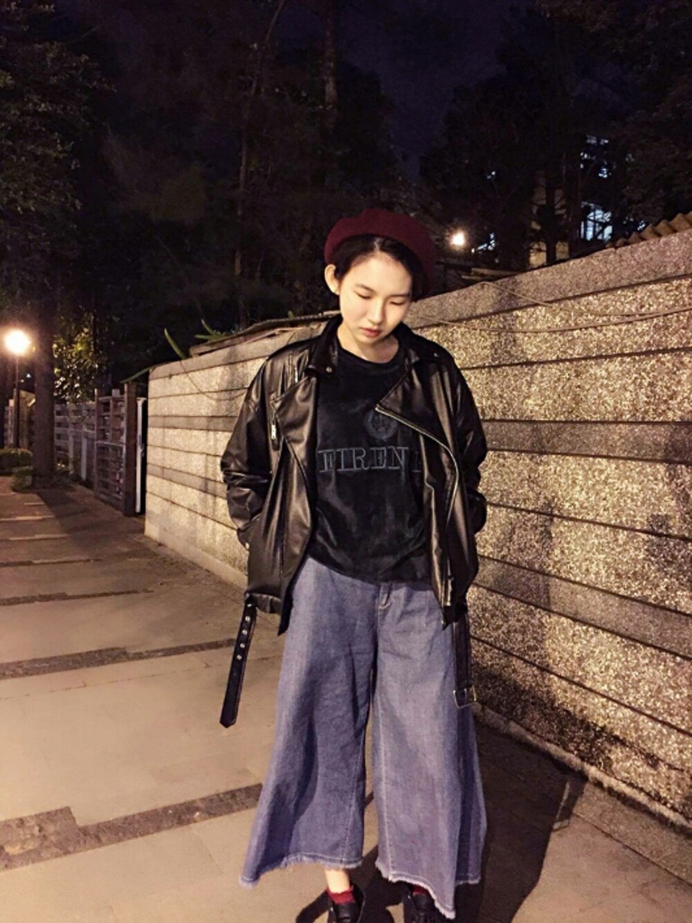 反光絨面大學t 啞光皮衣 牛仔不收邊寬褲 上窄下寬 讓比例拉長