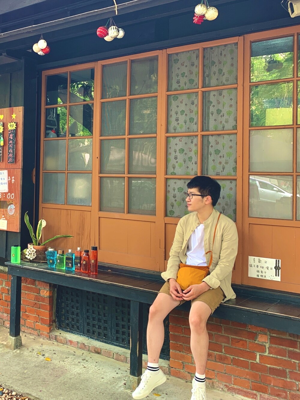 簡單的一件白色T-shirt 套上卡其色襯衫 簡單的大地色搭配,襯托出那簡約的土黃色小側包。 A simple white T-shirt with a khaki shirt. The simple earth color collocation sets off the simple earthy yellow side bag.