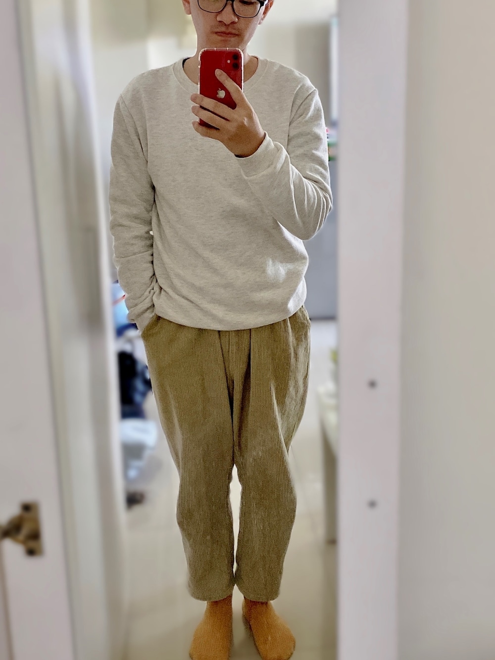 簡單好入手的米白色大學T搭上同色系的燈絲絨長褲及亮眼的土黃色襪子,一起融入大自然吧! The simple and easy-to-be beige university T-shirt put on the same color of velvet trousers and bright earthy socks, let's integrate into nature together!