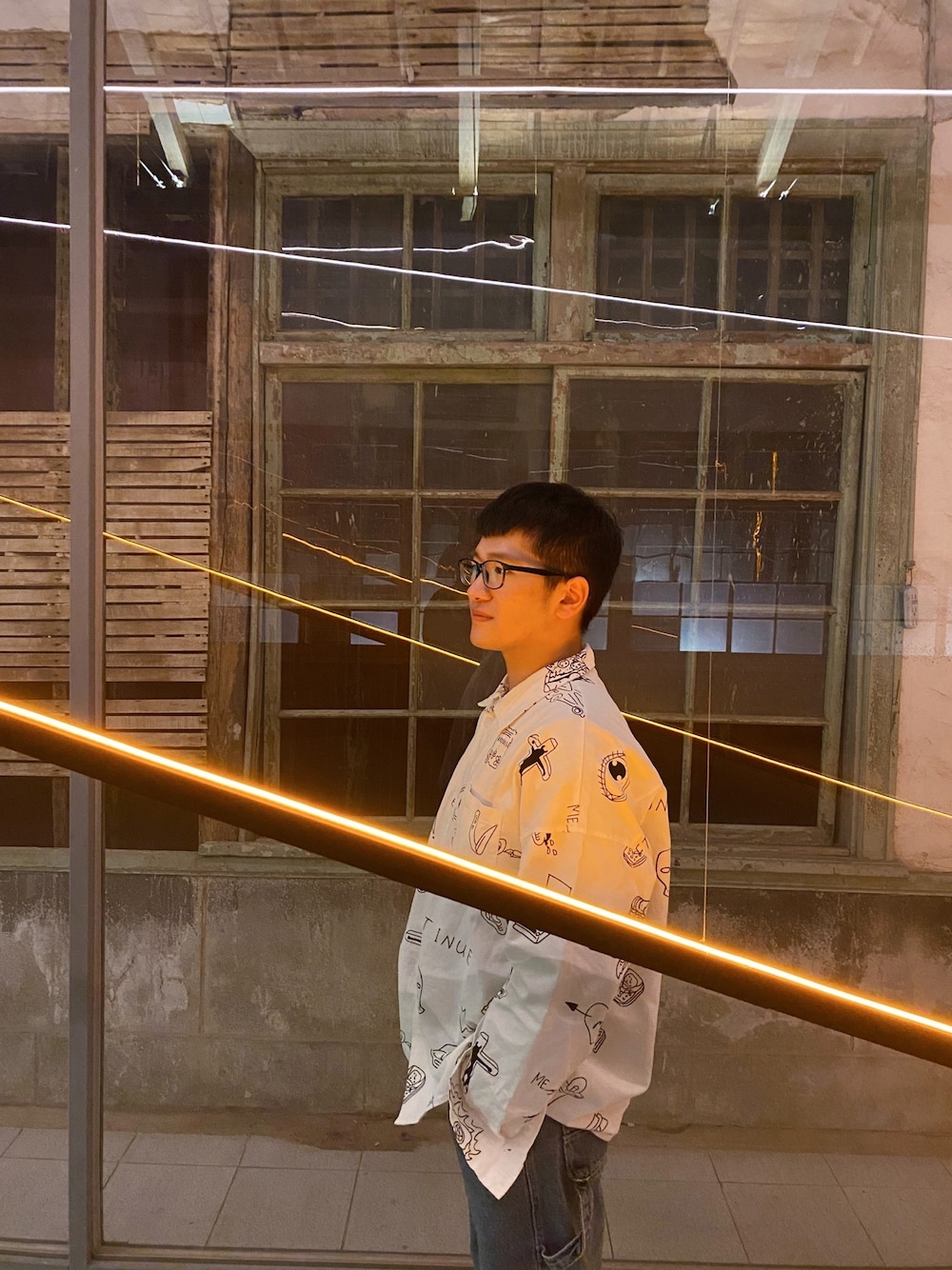 寬版塗鴉白襯衫搭配牛仔工褲