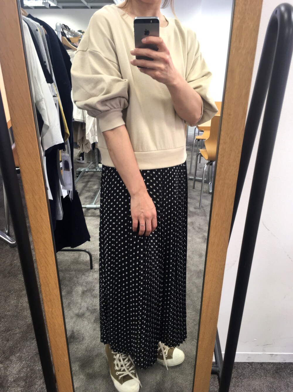 楽チンワンピ。 スウェットとプリーツドットの組み合わせがかわいい。