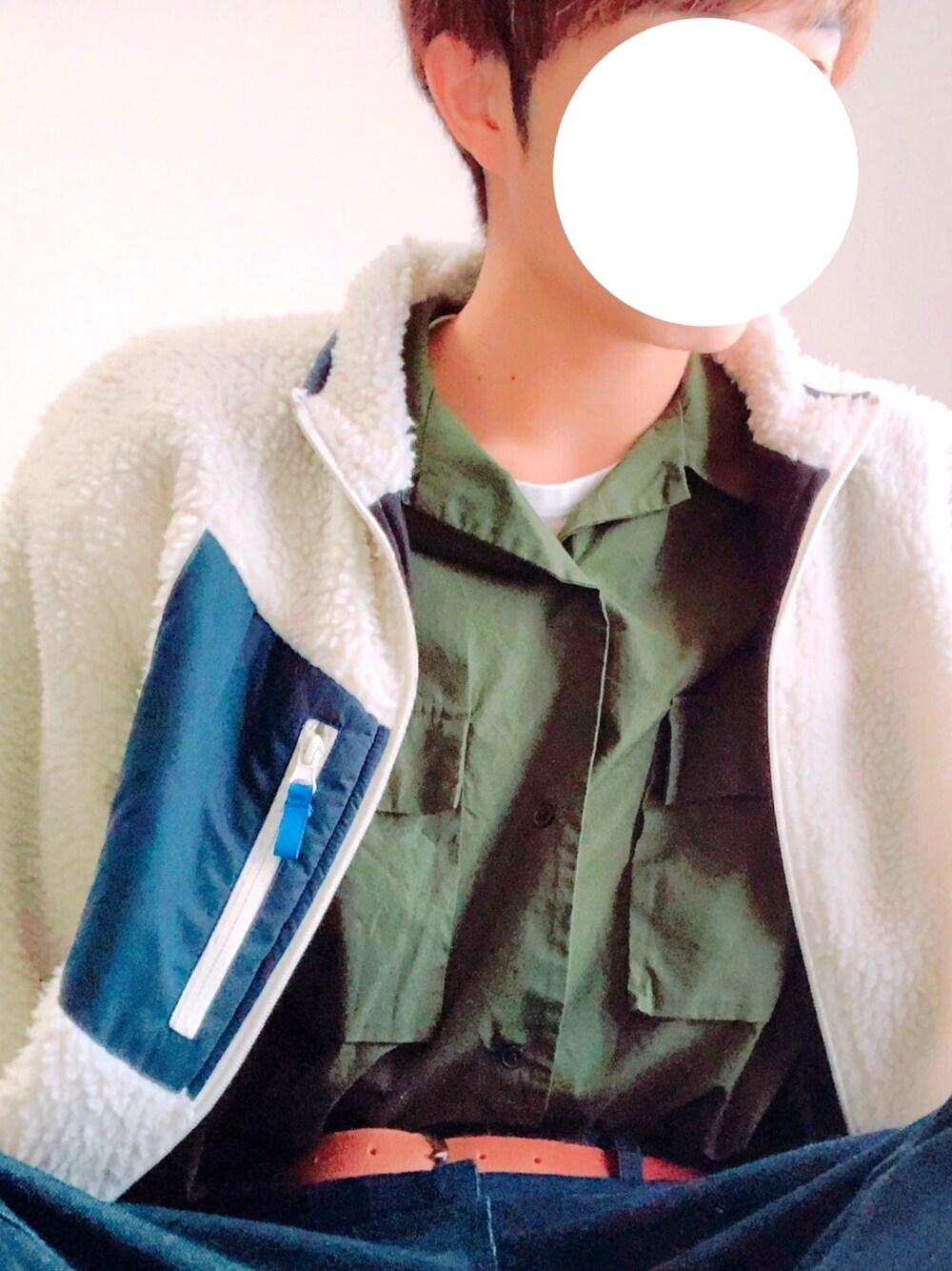 座っていて全然わからないけれど一応タックインコーデ(^_^;) グリーンのミリタリーシャツをボアジャケットで優しい感じにしています!