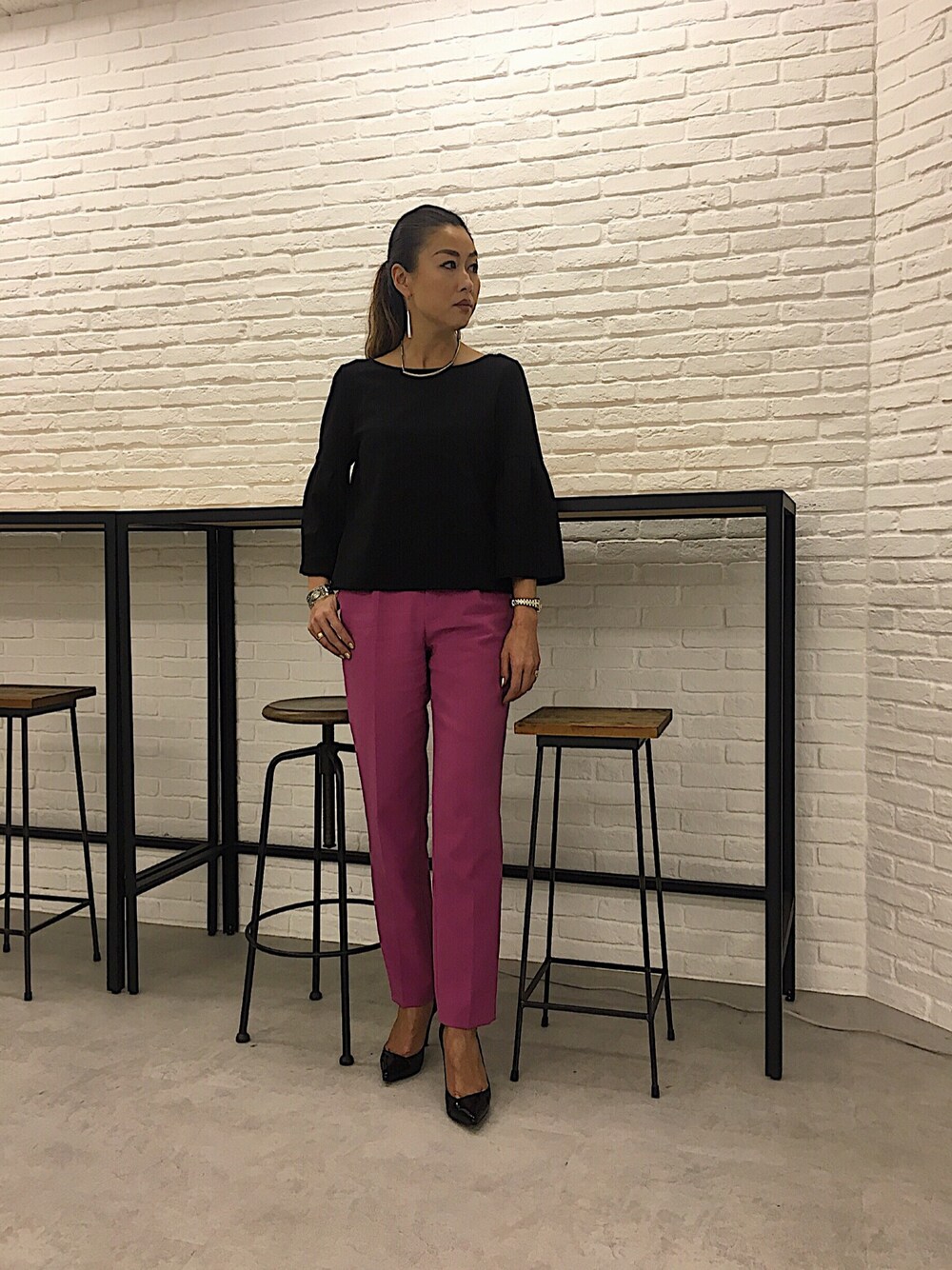 今年のS/S外せないカラーボトム☺︎ 鮮やかカラーのピンクには 安心の黒を合わせて🙌 着心地の良いポンチ素材のトップスと 程よいハイウエストパンツは シルエットが新鮮でおススメ!