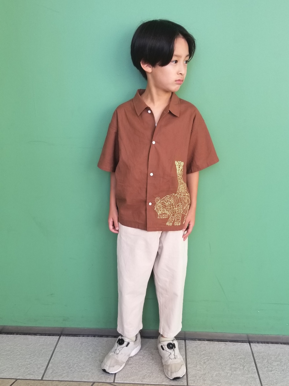 ローリーズファームキッズシャツが他ではあまり見かけないデザインとカラーで◎ 綿麻生地ですずしいです