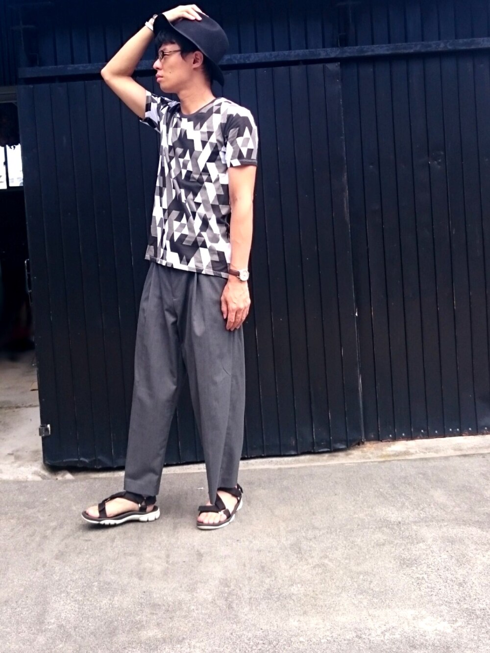 最近シンプルな格好ばかりだったので、今日はタッキースタイルに挑戦! 色使いはモノトーンに抑えつつ、トップスを総柄にしました。 シルエットはトップスがタイトなので、ワイドパンツでAラインを意識してます。 あとは全体的にカジュアルめなので、ハットでバランスをとったつもりです😃