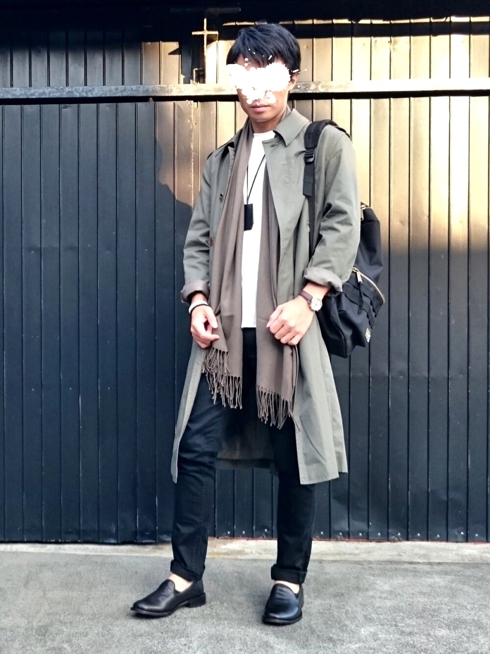 今日はロングコートメインのコーデです! このコートはフランス軍実物のステンカラーコート✨ 軍物だけあって作りはかなりしっかりしてますが、全体的に大きいのでお直しに出してます。 コートのシルエットは変えずに、袖幅を詰めてボタンを本水牛に変えるだけで かなり印象が変わりました😄 上半身はコートとストール、リュックでボリュームを持たせて、 下半身は黒のスキニーデニムで細身にしてメリハリをつけました。