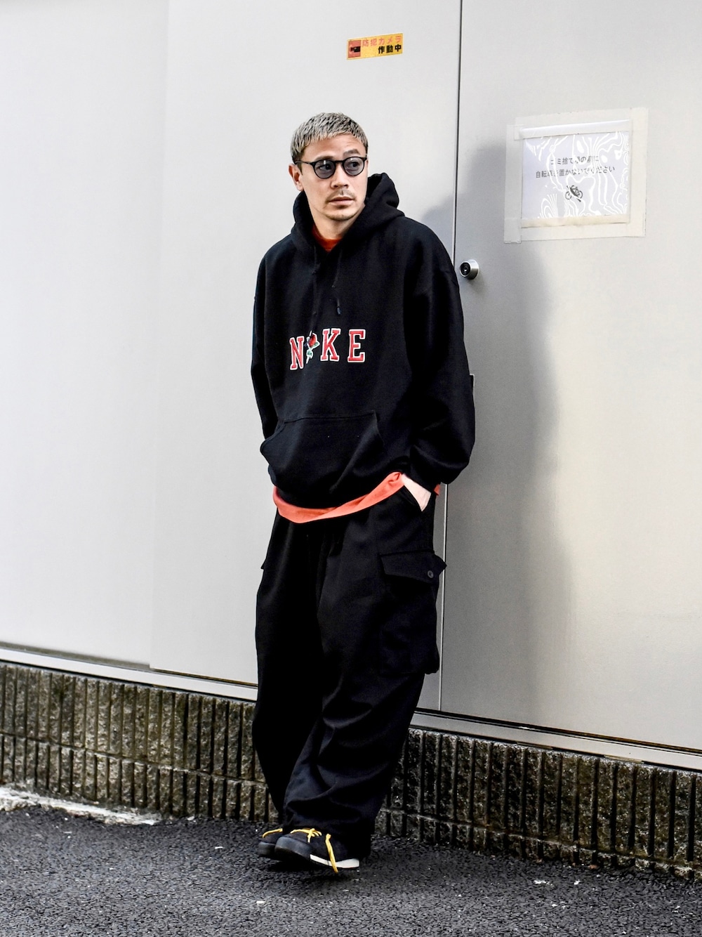 Parka : #Vintage Inner : #Vintage Pants : #yotsuba_tokyo Glasses : #oliverpeoples Shoes : #nike 今日は古着で見つけたNIKEのパロディーのパッチが付いたスウェットパーカーを主役に🔥 昔っからこういうパロディー系のアイテムは目がなくて見つけるとついつい買ってしまう... コーディネートは黒のジャージカーゴパンツ合わせたけど暗くなり過ぎないようにオレンジのTシャツをレイヤードして黒と黒の間に差し色をプラス👍🏻