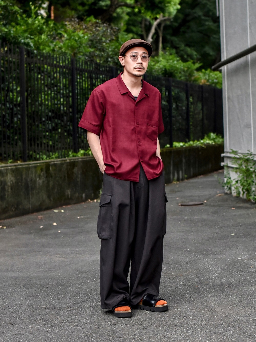 Shirt : #tactac Pants : #yotsuba_tokyo Cap : #Vintage Glasses : #oliverpeoples Shoes : #henderscheme この日は #tactac のワイン色のオープンカラーシャツを主役に🤙🏻 ここ数年ワイン色の服を見つけると毎度のように買ってしまう。 ブラウンや黒との相性が良いし、髭面や日焼けした肌とも良く馴染むし、大人っぽい渋い印象を演出出来るのが心地良い。 こちらのシャツはドライなリネンライクなポリエステル生地で洗濯もガンガン出来るし、シワにならない点も夏場は有難い。 コーディネートはカーゴパンツにハンチングを合わせてヴィンテージテイストに👍🏻