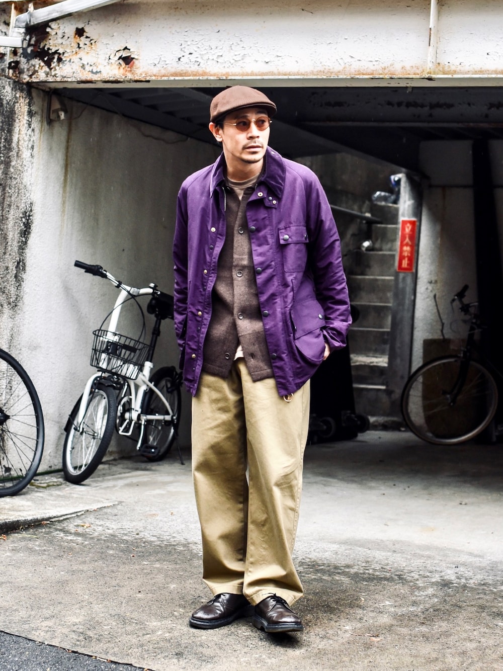 Jacket : #unused Knit : #UniqloU Pants : #UniqloU Cap : #vintage Glasses : #savilerow この日は雨が降っていたので水も弾いてくれる @unused_looks のナイロンジャケットを主役に。 Barbour型のワークジャケットでカラーは紫。 ワックスコットンの無骨な感じもカッコいいですが、ナイロンジャケットだと雨も弾くし、洗濯もお家で出来て気軽に着られる♪ 紫ってのも定番の黒やオリーブとはまた違う雰囲気で良いんです👍🏻