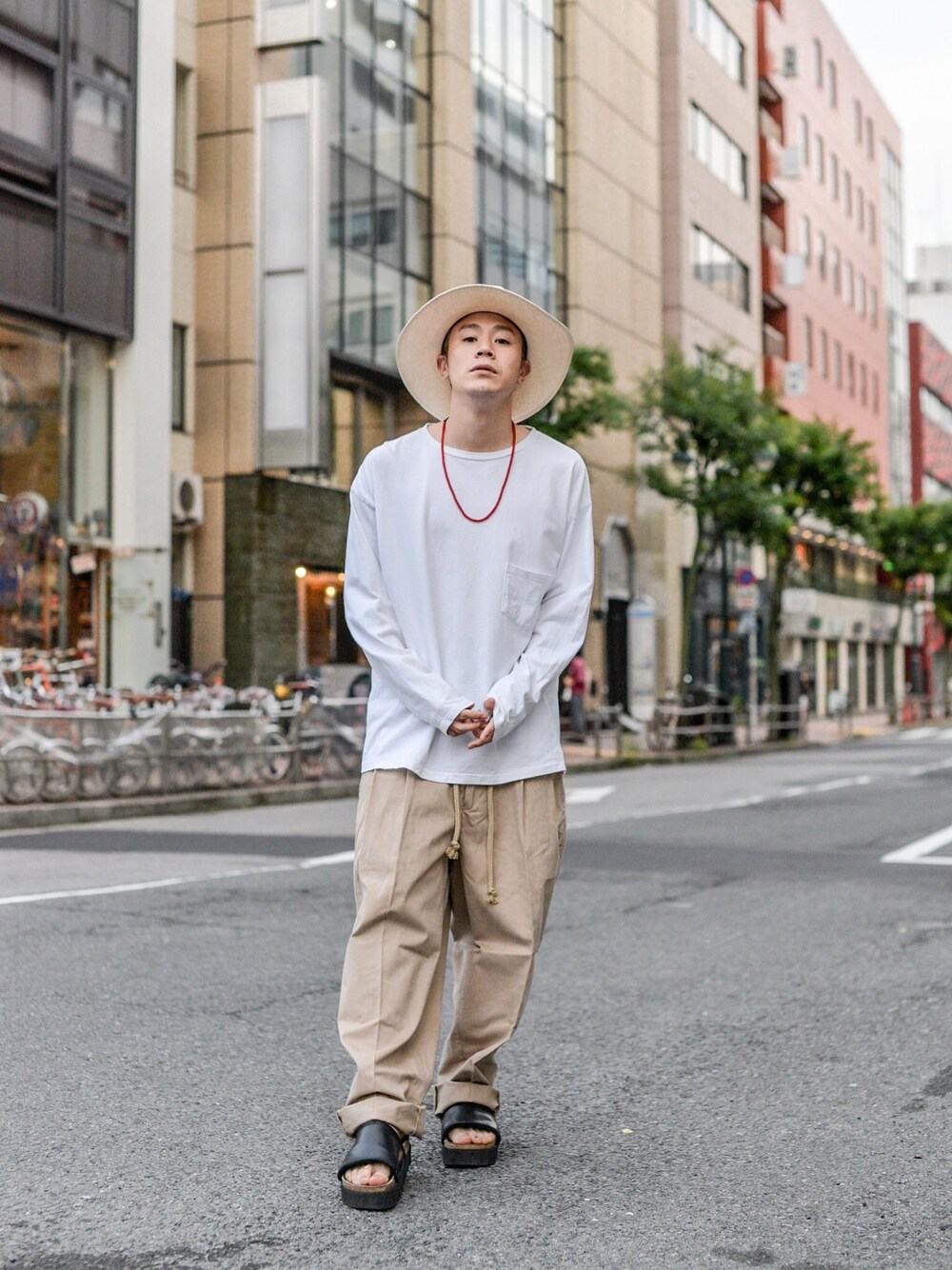 微妙な気温のこの時期がロンTの一番の使いどき‼︎ yotsubaのベージュのワイドパンツと合わせてシンプルにスタイリング。 赤いビーズのネックレスをポイントに。