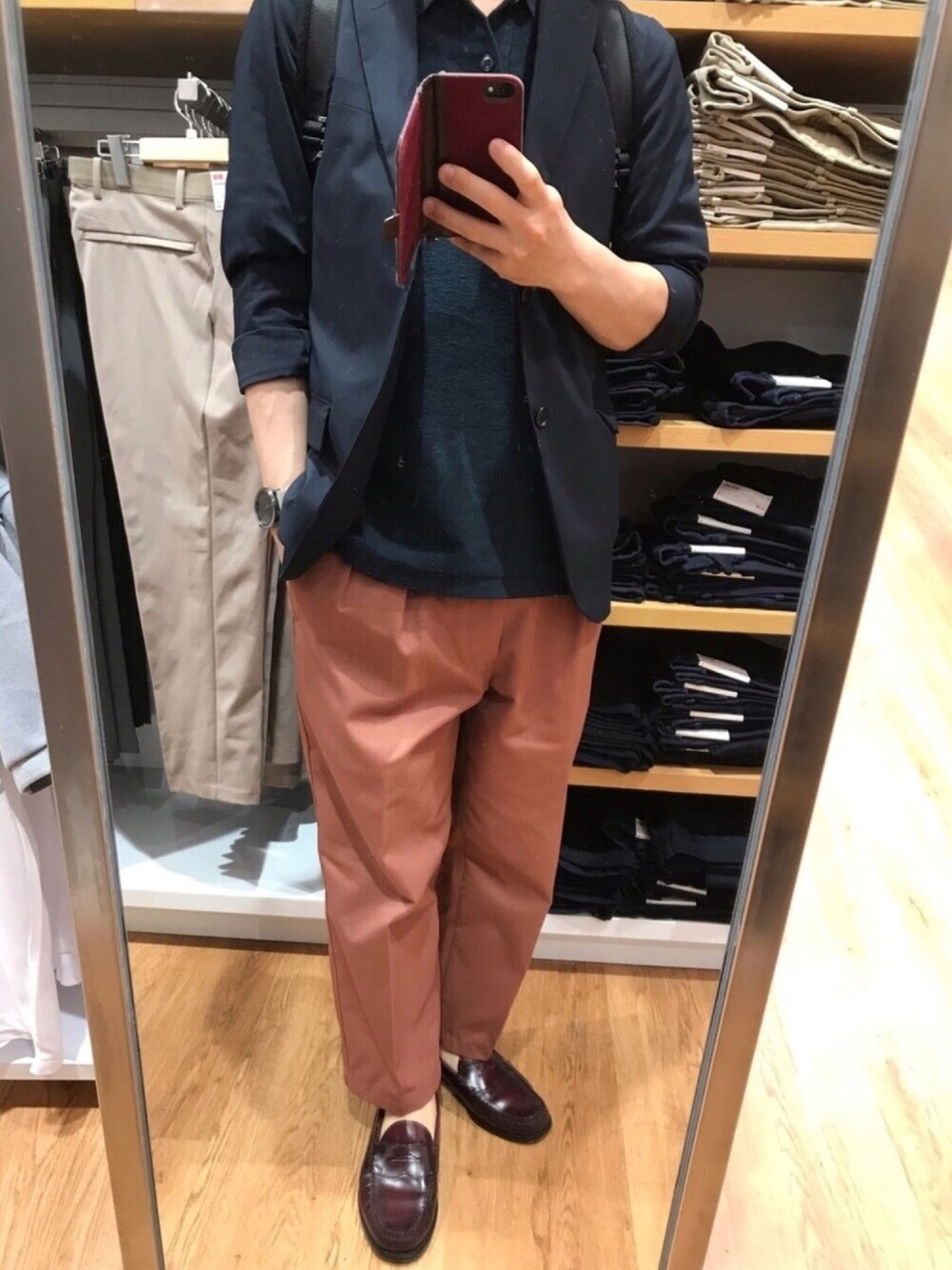 街着としてのドレススタイル… ユニクロU2019SSのポロシャツとチノパンを使った着こなし シルエットはドレスライクでも、パイル地のポロシャツにピンクベージュのチノパンを合わせることで程良くカジュアルに 街着としてはこのくらいのバランスが丁度良いかと…(もちろんTPO次第ですが…)