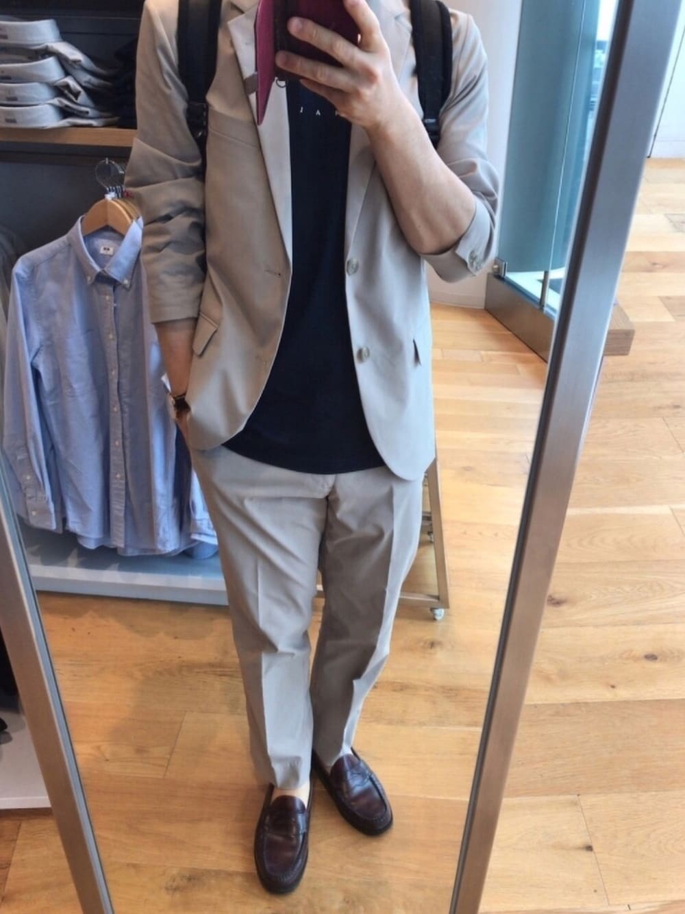 コレ、意外と良品かも… ユニクロの感動ジャケット&パンツを使ったベージュのセットアップコーデ インナーはGUで790円+税のグラフィックTですが、これが意外と使えるんですよね… ド派手なバックプリントに気を取られがちですが、前面はVAN HALENの文字デザインのみで割とシンプルなので、インナー用と割り切って考えれば意外と良品…? この手のデザインTシャツはファッション的に使えないものが多いのであまり注目していませんでしたが、これは珍しく当たりでしたね