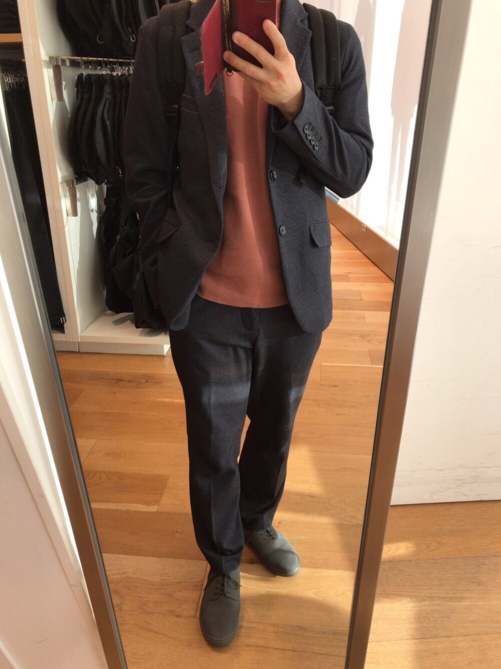 キメ過ぎにならないバランス感覚… GUのセットアップを使ったドレススタイル カットソー素材のセットアップにピンクベージュのニット、革靴ライクなスニーカー…と、素材・カラー・デザインで少しずつ崩している分、ドレスライクなアイテムでまとめてもキメ過ぎな印象にならない