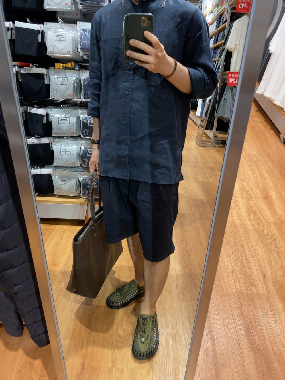 長袖シャツ×ショーツはテンプレ ユニクロ×JWアンダーソンのリネンシャツにMUJI Laboのデニムショーツを合わせた着こなし ショーツにサンダルの組み合わせはカジュアルに寄り過ぎるのであまりやらないんですが、今回はバランスが取れそうだったので採用してます