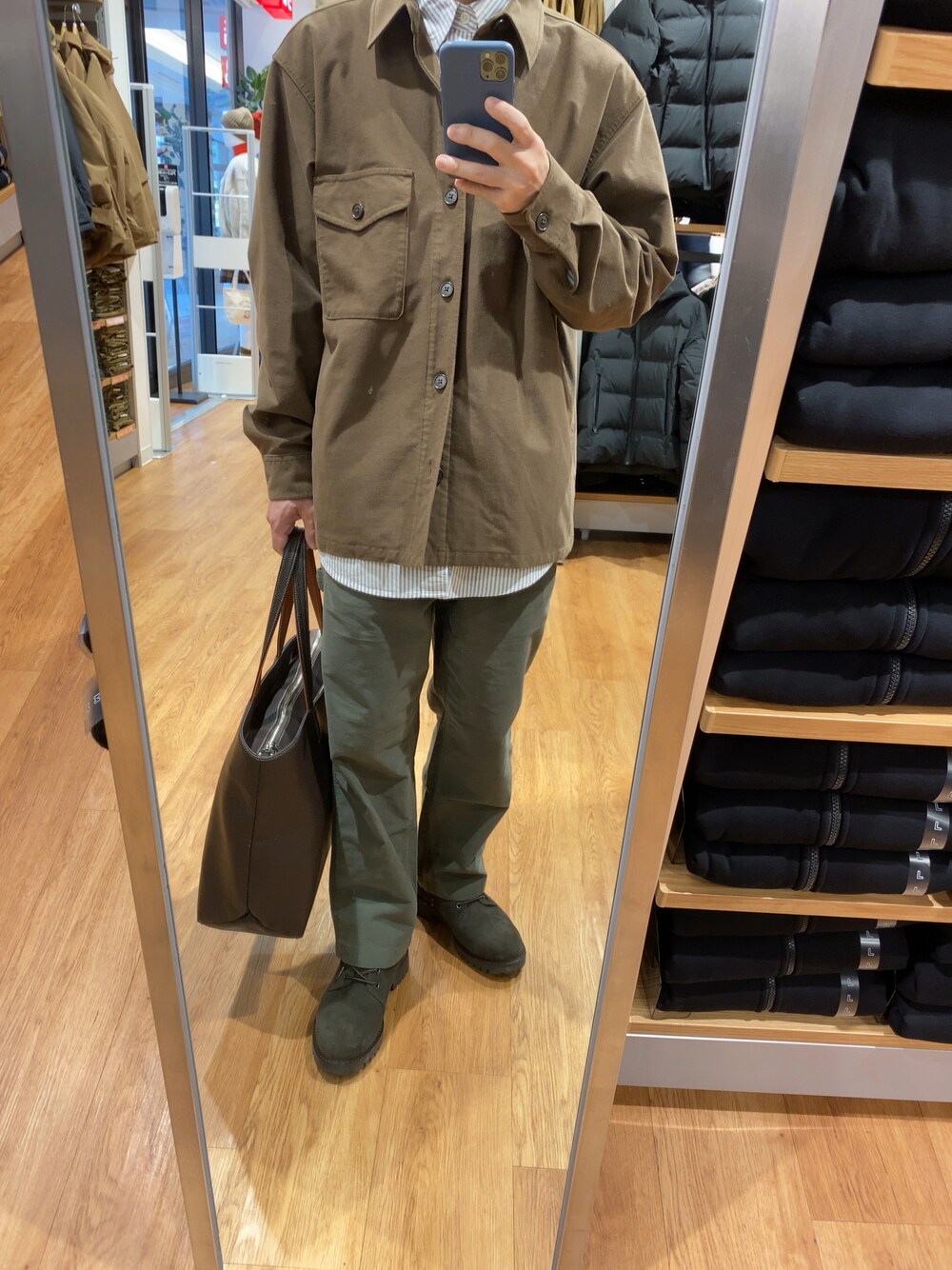 ユニクロ式ワークスタイル ユニクロのシャツジャケットとワークパンツを合わせた着こなし インナーのオックスフォードシャツとブーツはGUの物を使用