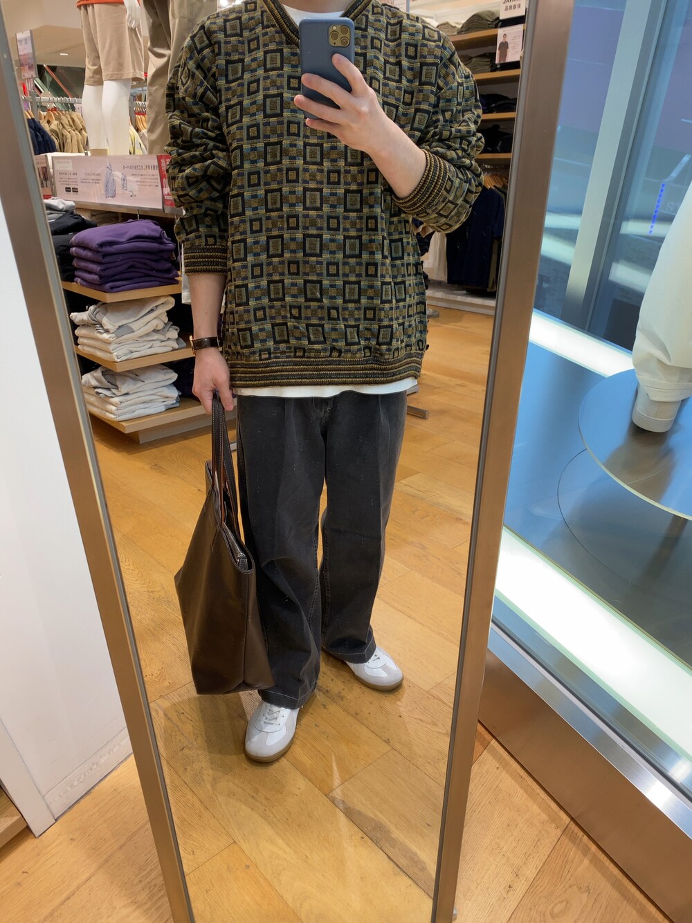 古着と言えば柄物 古着の総柄ニットを使った着こなし 首元がVネックなのでインナーにクルーネックの白Tをレイヤードして、いやらしくなり過ぎないようにしています 古着の柄物は独特なものが多くて面白いですよね