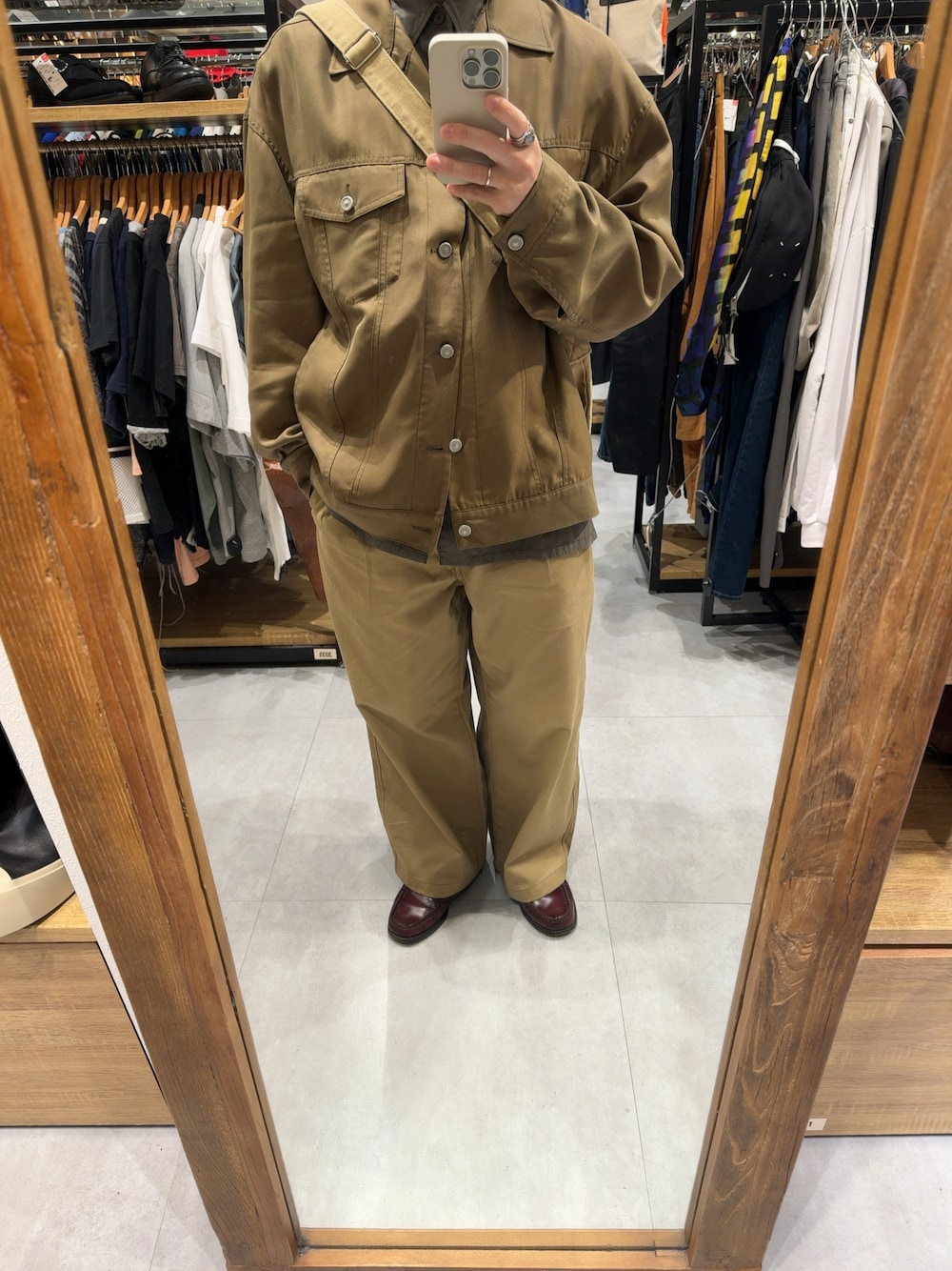 ベージュで作るキレイめワーク メゾンスペシャルのワークジャケットを使った着こなし デニムジャケットのデザインでワークっぽいベージュカラー、でも素材感は光沢があってドレッシーという独特な雰囲気に惹かれて買ったジャケットを同系色でまとめてみました パンツもスラックスライクなチノパンを合わせて、全身ワークスタイルでもキレイに見えるようにバランスを取っています