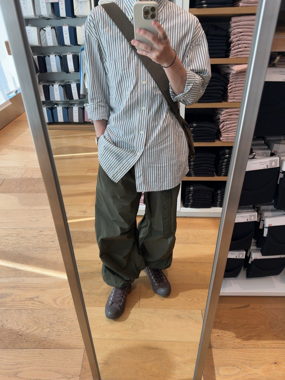 リユースショップで買ったコンバースオールスターが履きたくてコーディネートを組んでみました ミリタリーカラーのパンツの裾を絞ってオールブラウンのハイカットのオールスターを合わせるとコンバットブーツみたいで渋いですよね 下半身の土臭さとバランスを取るために、トップスには清潔感のあるストライプシャツを合わせています