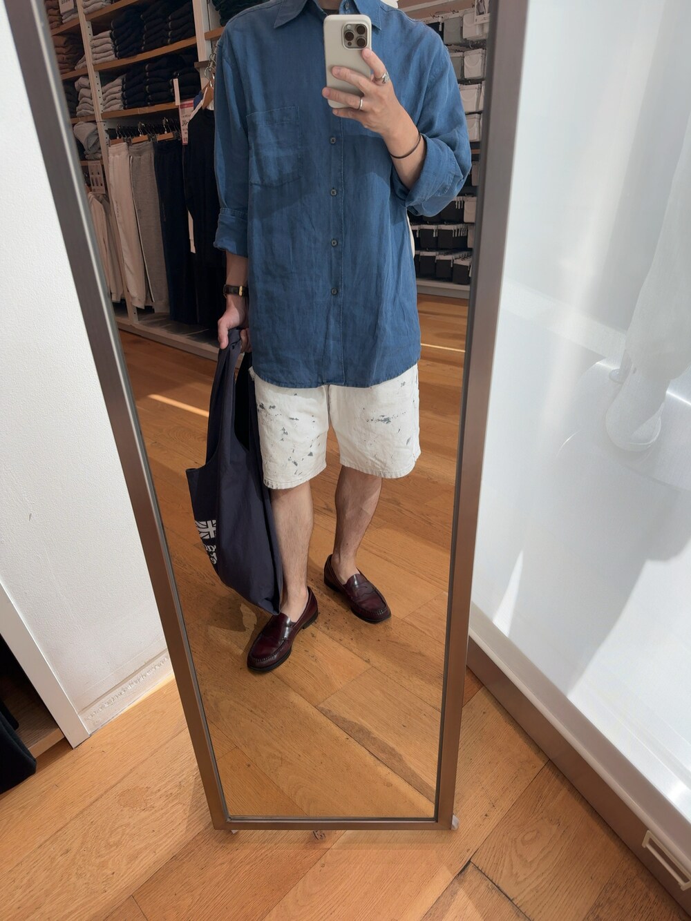 上下古着で合わせた夏コーデ ブルーのリネンシャツとホワイトのショートパンツで一見ただの爽やかコーデかと思わせつつ、パンツのペンキ汚れが良い味出してますよね