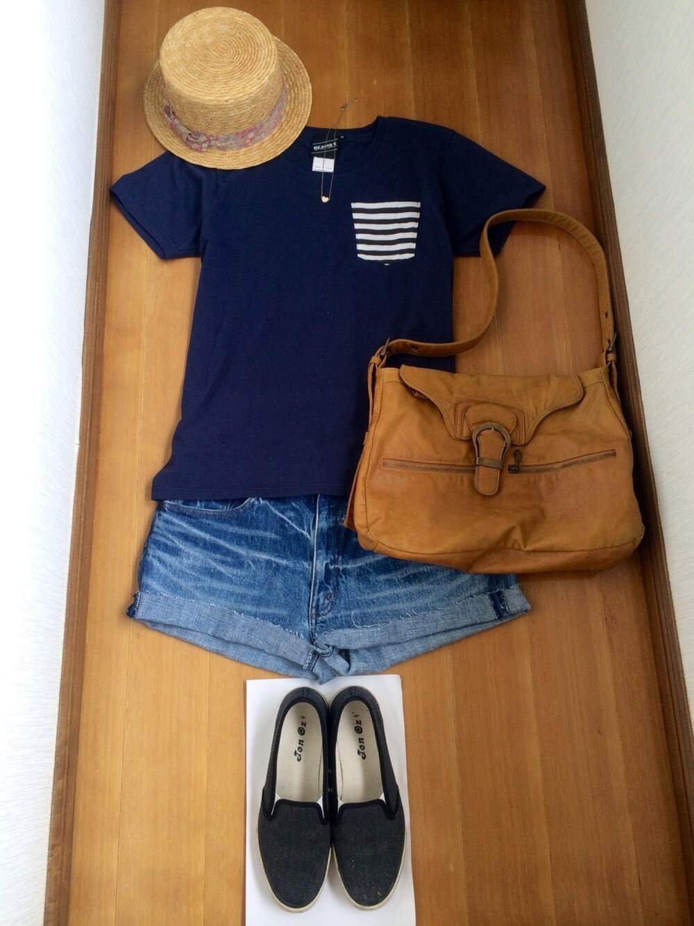 帽子/INDEX Tシャツ/BEAMS T ショートパンツ/古着 バッグ/Ray Cassin スリッポン/しまむら ネックレス/BEAMS