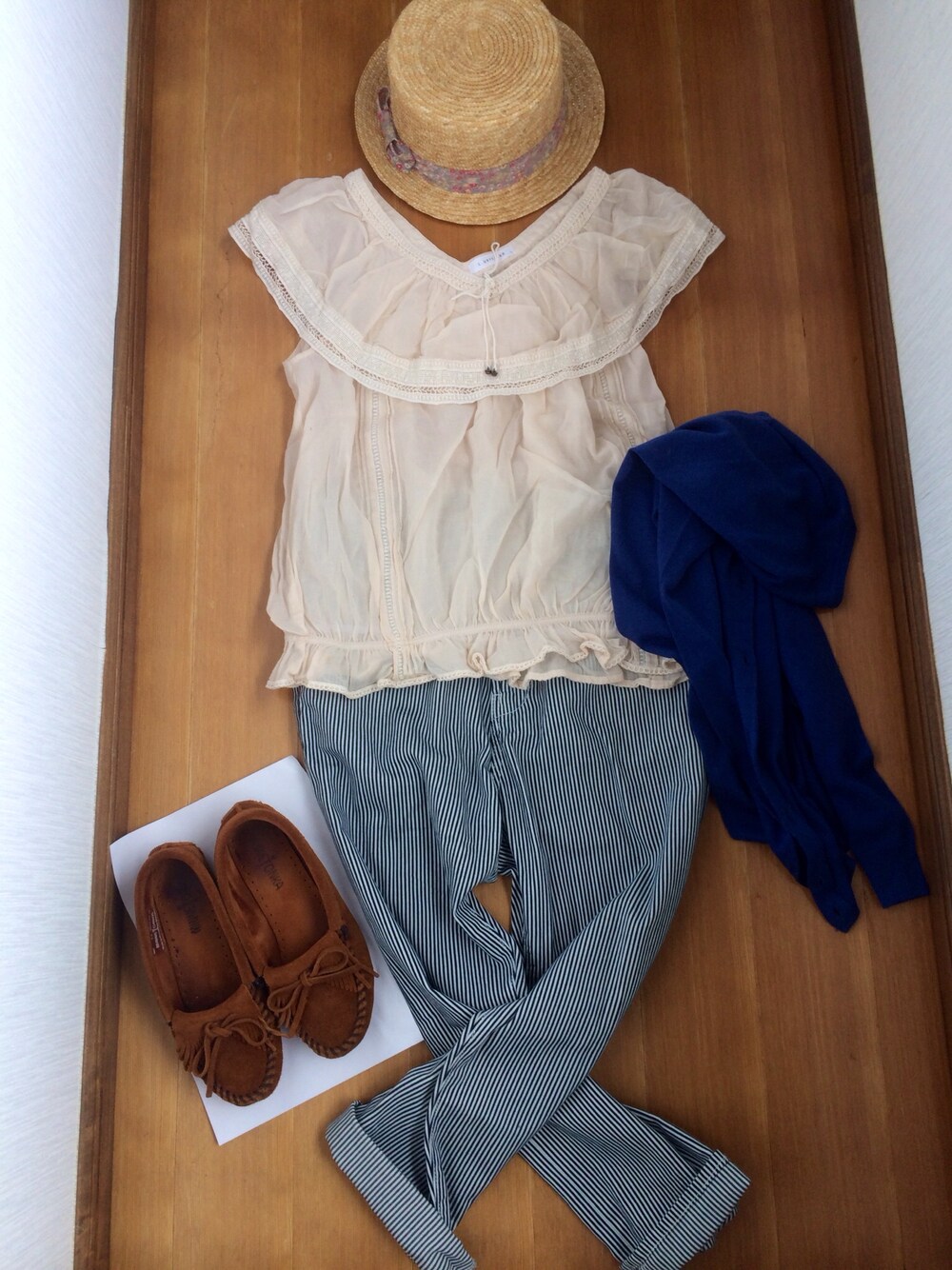 トップス/LOWRYS FARM カーディガン/しまむら パンツ/GU 帽子/INDEX 靴/ミネトンカ マリンコーデといえば、ホワイト、ブルー、ボーダー、ストライプなイメージ*\(^o^)/* しまむらのカーディガン、色も着心地もいいし、UVカット機能もついた優れもの。 お値段も相変わらず素晴らしい‼︎